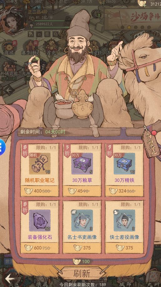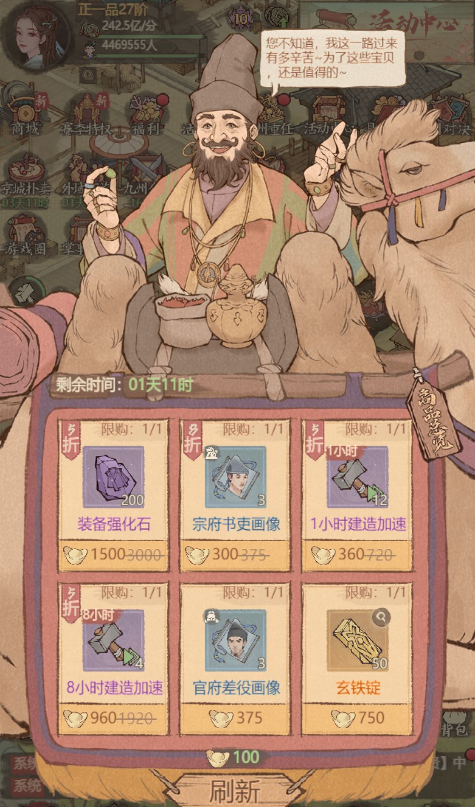 外域商人活动是《这城有良田》中一项极为重要的周期性福利活动,为玩家提供了通过消耗元宝获取稀缺资源的宝贵机会,同时搭配元宝消费活动,可额外领取丰厚奖励,以下是该活动攻略。 一、活动玩法 活动持续5天,在活动期间可进入外域商店,使用元宝购买各类道具。商店商品会随刷新而改变,刷新需消耗元宝,且消耗金额随着刷新次数增加而递增,具体为前 3 次刷新仅需 5 元宝 / 次,第 4 - 10 次 50 元宝