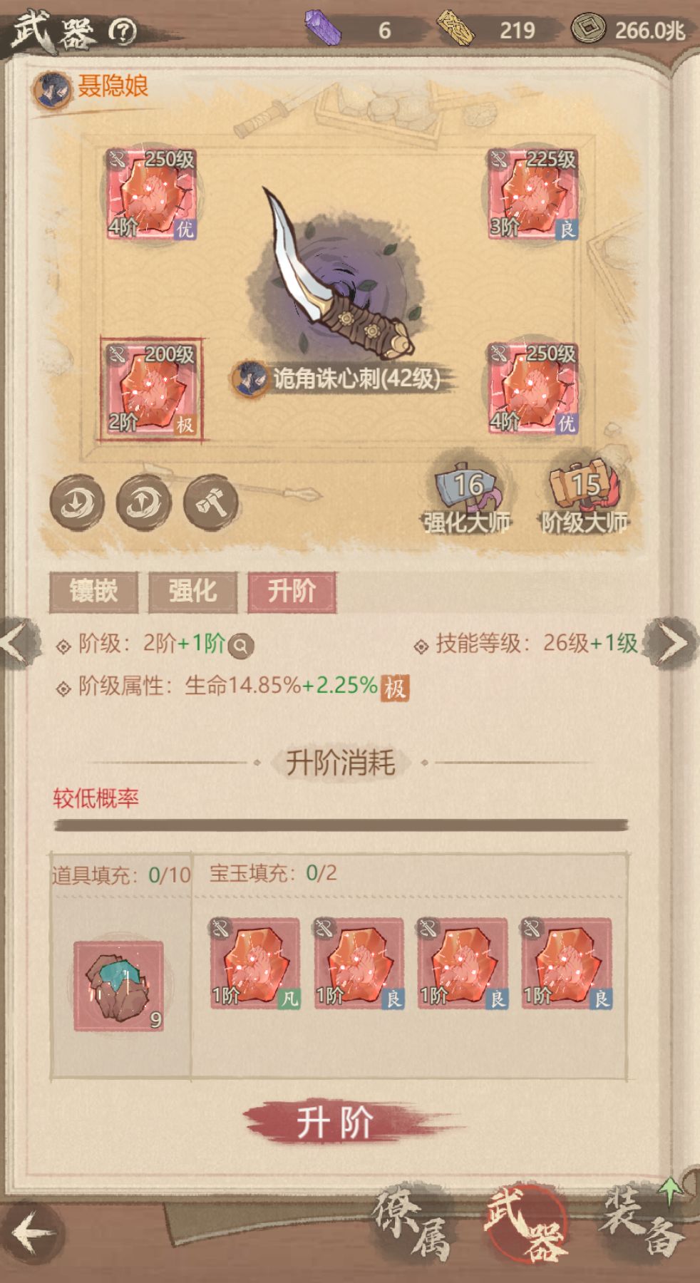 五、学识升级 —— 多途径收集,全面提升 学识升级能让僚属掌握更多独特能力,分为手记和秘典两个方面。 手记升级:攻打山贼是获取手记的主要途径,只要日常有体力,就去挑战山贼,大量手记轻松到手,升级学识 So Easy! 秘典获取:州府、演武、会武、农林小屋以及各类活动,都设有秘典兑换渠道。参与这些活动,用活动积分兑换秘典,为僚属学识升级添砖加瓦。 六、武器升级 —— 不同阶段,针对性提升