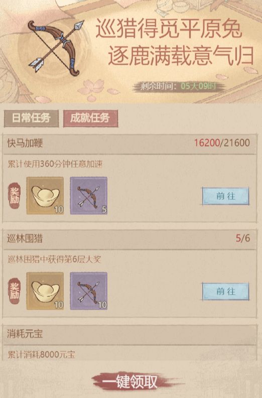 #这城有良田 #这城有良田攻略 巡林围猎活动持续7天,玩家使用弓箭围猎获取奖励。活动分多个轮次,每轮有一个大奖,获得后可进入下一轮或继续当前轮次。零氪玩家差不多可达到第6-7轮大奖,活动结束时,未使用弓箭按1:2比例转化为元宝,一起来看看怎么玩收益最大吧! 弓箭获取途径 巡猎商店是获取弓箭的主要来源,可以使用木材、粮草、金矿和元宝兑换共计1950个弓箭。每日日常任务可获得100个弓箭,7天共70