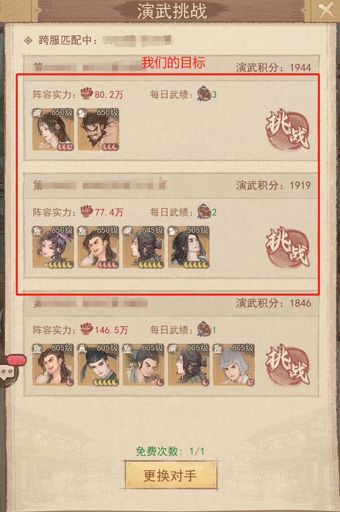 #这城有良田 #这城有良田攻略 通过“城郊”-“演武场”,每人每天可免费挑战6次演武挑战。平民玩家拿满14积分,每天最多免费获取2400演武币。一周就是16800演武币,1个月就是67200演武币。 只要拿满奖励,每个月至少可以在演武商店兑换30个“外域僚属碎片”,或者攒2个月兑换一个“稀有自选”盒子,还是十分不错的。 如何获取14积分? 演武挑战会显示三个对手,胜利后可获得不同积分: 第一排挑