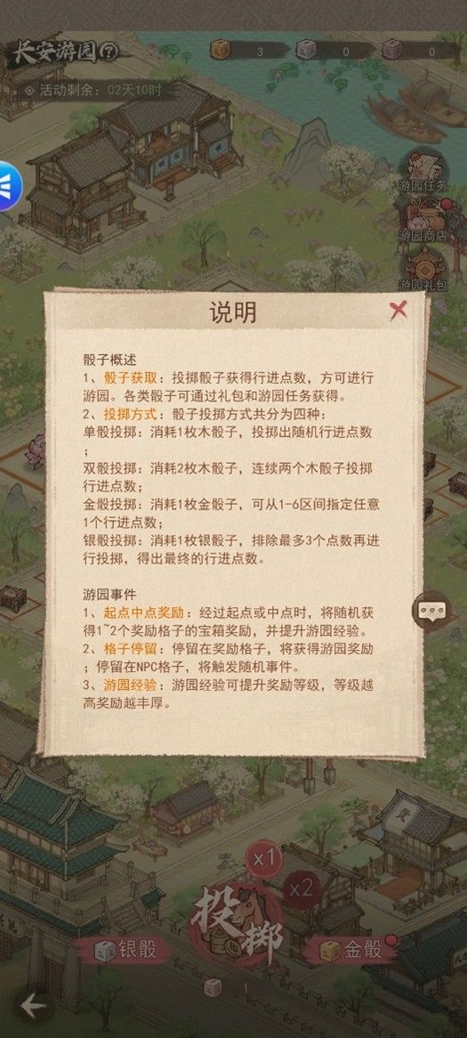 长安游园,是一个性价比很高的活动,无论对于氪金玩家还是平民玩家,都不能错过。 一、活动介绍 长安游园活动主要通过投掷骰子前进,到达特定位置后可以获得各种奖励,包括资源和花朵。 骰子介绍: 木骰子:每次投出1-6随机数。 银骰子:排除选中的3个位置,随机投出剩余的3个位置。 金骰子:投出指定位置。 二、技巧 每次只使用一个木骰子。不要选择2个木骰子一起抛 前两轮不建议使用银骰子,以免造成资源浪费。银