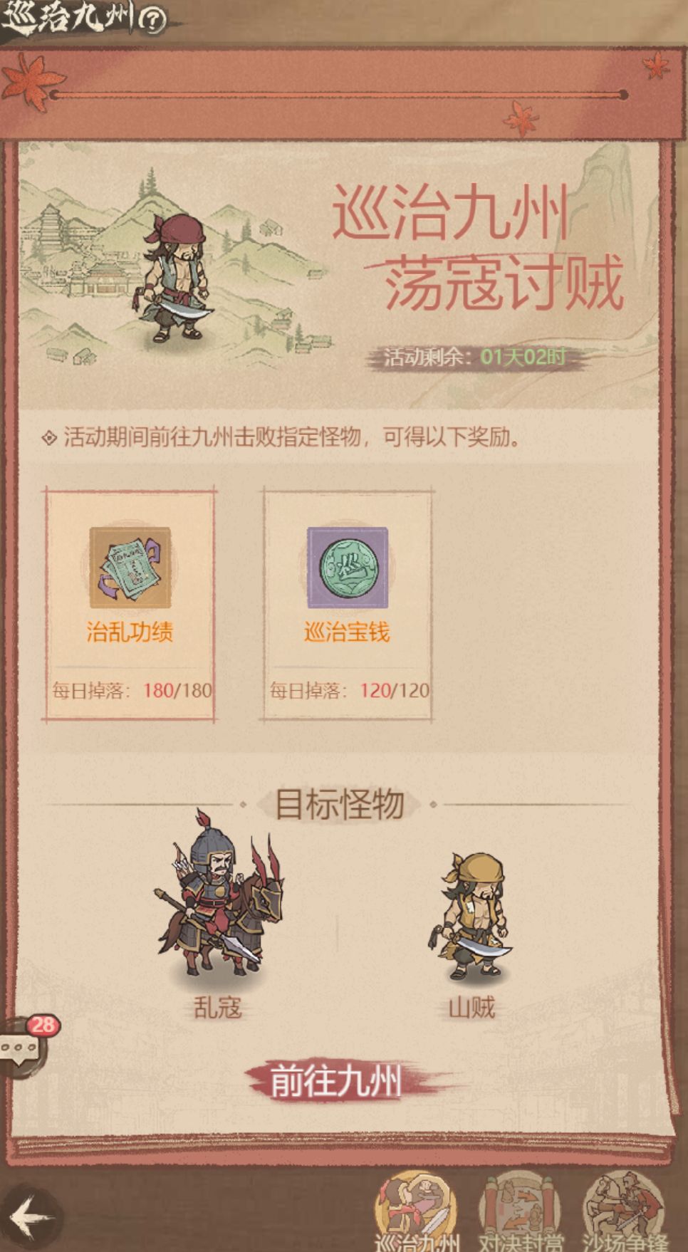 巡治九州是《这城有良田》中的常驻活动,每个赛季开启一次 。 此活动对平民玩家十分友好,武力值要求低且玩法简易。活动期间,玩家可通过击败山贼和敌寇获取相应货币,进而在巡治商店兑换各种实用道具。而且巡治宝钱和宝钞没有时间限制,可以多囤一些来换道具。 一、玩法概述 巡治九州是《这城有良田》中的常驻活动,每个赛季开启一次 。 此活动对平民玩家十分友好,武力值要求低且玩法简易。活动期间,玩家可通过击败山贼