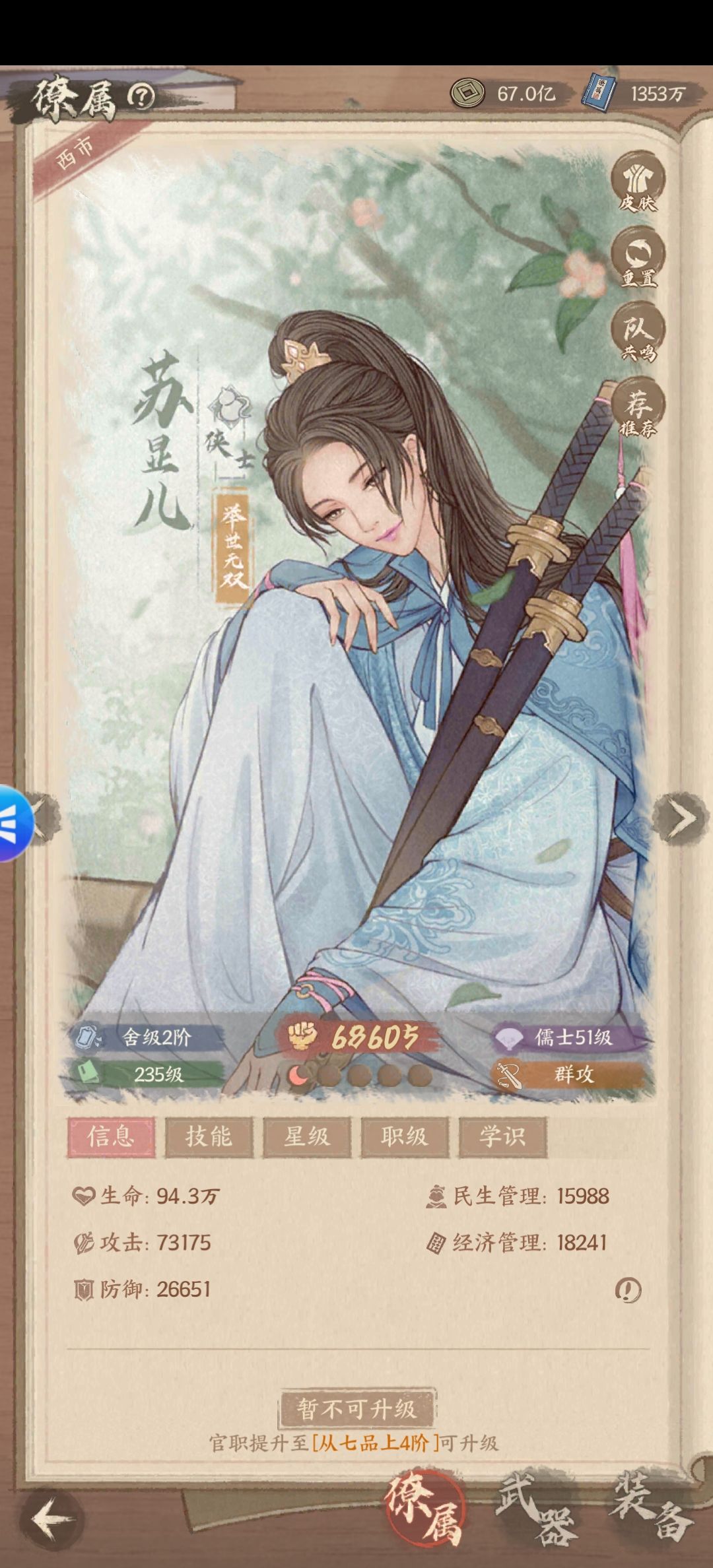 平民玩家没有抽到好的幕僚,苏显儿是你的不二之选,越级打超6-7w战力都可以,城池站,也可跨10w打,目前23.3以武会友都打到了9-10,这个搞了很多资源,性价比高,后面可以搞到新的可以资源置换,想玩李白的,6星以下真的难,陈子昂2星可以用,但感觉不如5星苏月儿,令月也是如此,令月比较适合打一些活动,群攻收益好, 补充:苏显儿最好搭配王昭君+暴击和链条,吸过来链条连上,直接死两个 目前整容和思路,