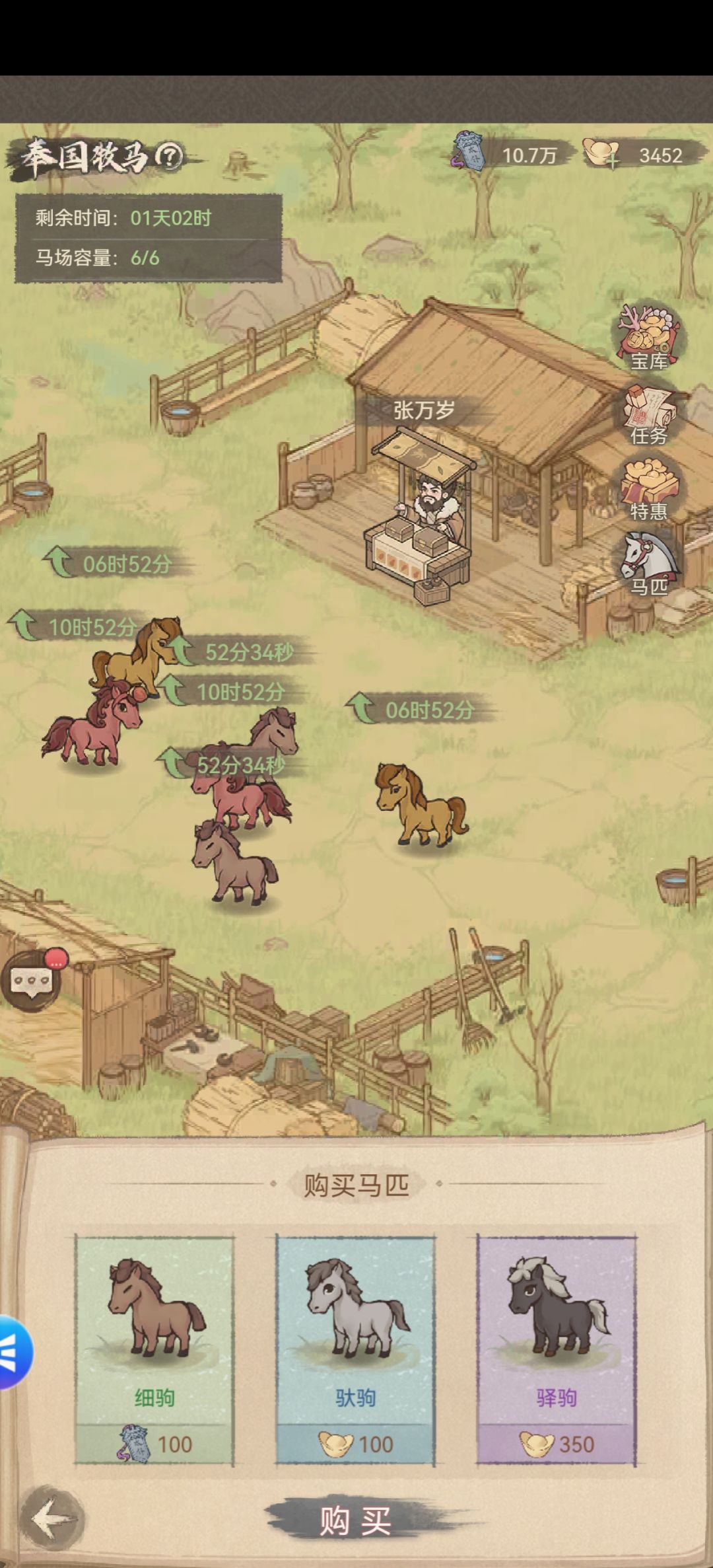 ●活动介绍 饲养马匹并繁殖,将成年马匹上缴可赚取太仆令,用于在奉国宝库兑换奖励。宝库共分四层,每层设有消费额度,需满足当前层消费要求才能解锁下一层。 马匹品质从低到高分为: 绿色(细马) 购买:100太仆令,上缴:200太仆令。 蓝色(驮马) 购买:100元宝,上缴:800太仆令。 紫色(驿马) 购买:350元宝,上缴:2000太仆令。 橙色(战马) 驿马繁殖获得,20%概率。上缴:500