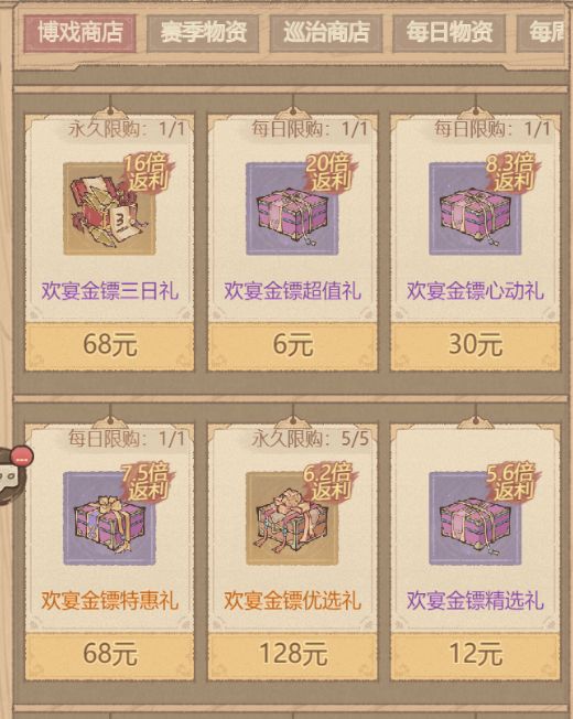 核心玩法 玩家需消耗道具【博戏金镖】参与活动,通过类似抽奖的机制获取随机奖励。每次投掷金镖可能触发不同倍率收益,获得道具。 博戏金镖的获取途径 日常任务与活动:完成每日任务可领取金镖,一天白嫖6个,一个活动周期可以白嫖30个。 商城购买:每日6元两个飞镖,68三日礼18个飞镖,这两个性价比最高。累计可以获得28个。 囤囤鼠战术 这个活动有一定概率,底层逻辑是几个大奖抽完这层都归你,进入下一层,所以