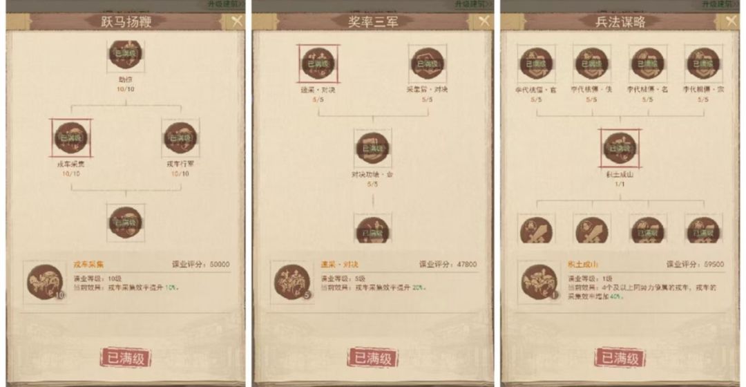 在前不久的改动中,九州搜索机制迎来大更新,可搜索的最高等级的田由4级提高到了6级,再也不会出现睡前找半天想找一块高级田都找不到的情况了,同时戎车负重也极大提高,小车也能很轻松的挖高级田,在这种情况下,地挖的好不好将会直接影响到一个平民玩家的发育速度 课业篇 第一点要注意的就是课业,对于提升戎车采集速度的课业要优先点,奖率三军中的速采和跃马扬鞭中的戎车采集一般都会随着课业的进度被顺手点满了,但对很多