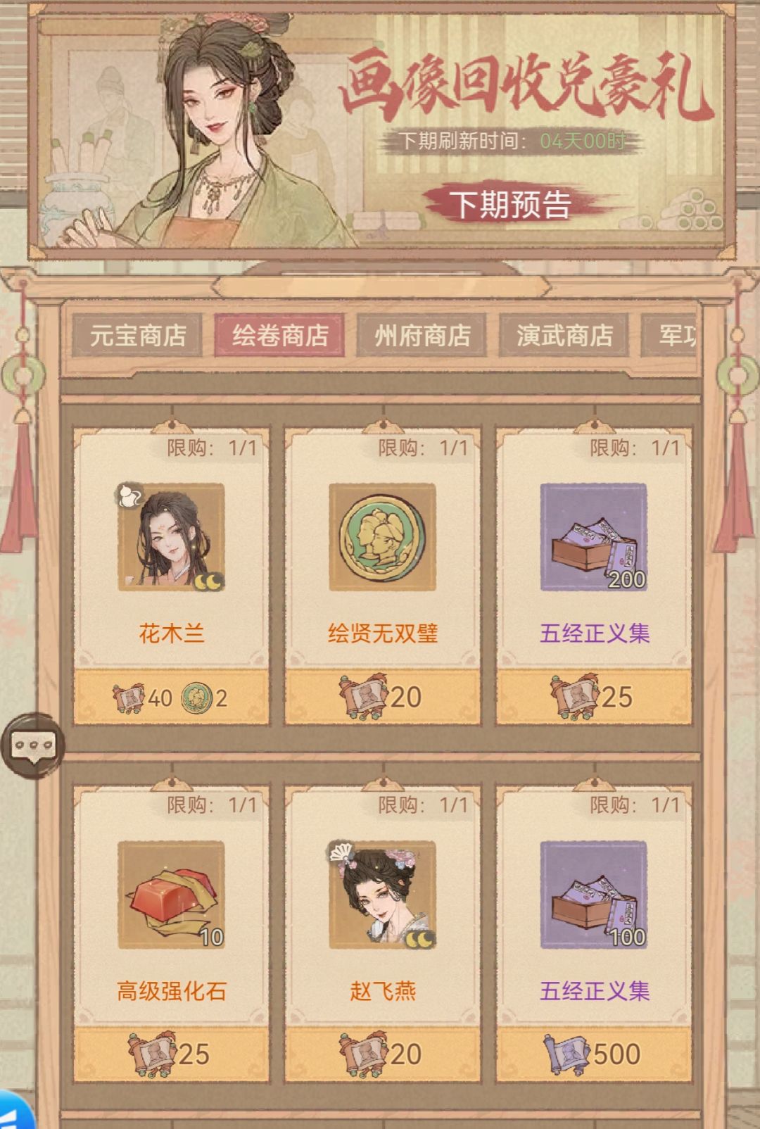 绘卷商店开启条件:升级任意橙色12星寮属即可解锁。建议升级门神类寮属:李裹儿,柴邵,张果,秦琼等,特别容易获取。 寮属画像售卖价格: 橙色稀有寮属:20橙色绘卷一个 橙色普通寮属:1橙色绘卷一个 紫色蓝色画像:一星画像3紫色绘卷一个 ● 兑换优先级推荐 1️⃣寮属类 绝代寮属(长孙无忌、花木兰):需40橙色绘卷+2个绿色珠珠,平民玩家最容易白嫖绝代寮属的途径,建议优先兑换。 橙