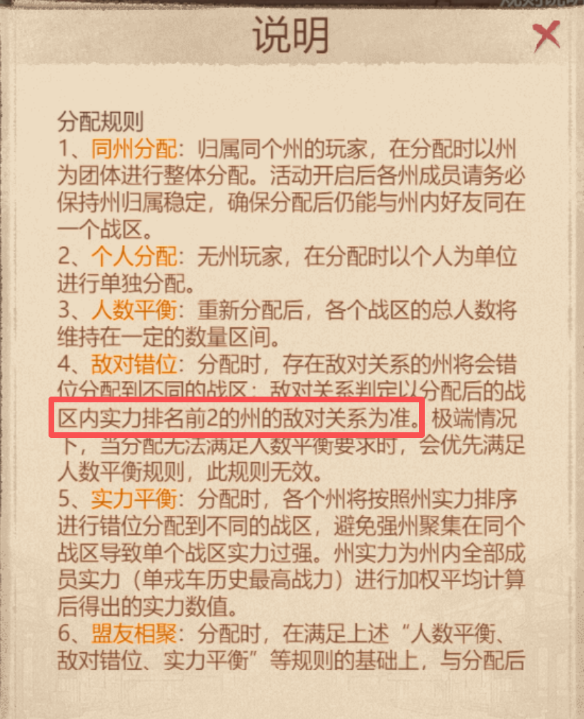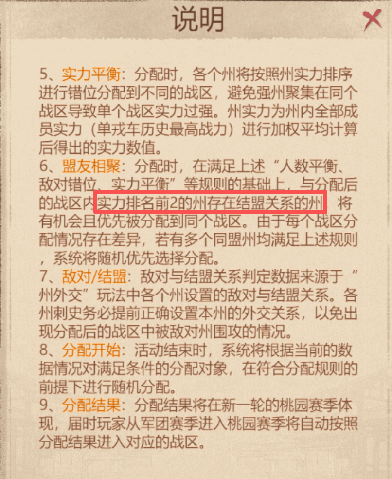 宝子们注意啦!史话赛季结束后,部分区服将重新分区,这次分区直接决定后续桃园赛季的战区环境、盟友分布和对战压力!这份攻略帮大家拆解分区核心规则、州外交实用技巧和关键准备事项,码住~一、分区核心规则本次重新分区的核心是 “公平平衡 + 外交关联”,9 条分配规则整理成 4 大类,一眼看懂!1. 分配单位:同州抱团,散人单独分配2. 平衡类规则:避免 “强州扎堆”“敌友同区”着重理解敌对错位: