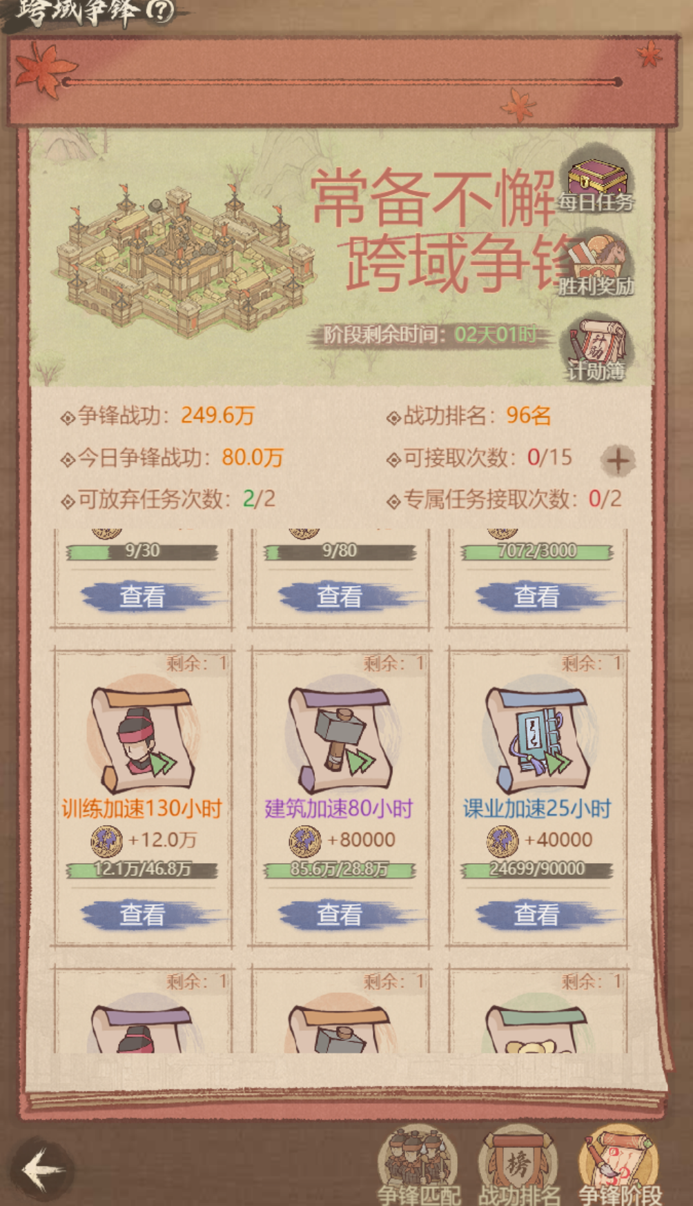 跨域争锋虽奖励被不少玩家吐槽,但只要摸透任务技巧、合理规划资源,低氪零氪也能在不额外多花的前提下,拿满适配自身的奖励,核心就是不硬冲高战功、优先低耗 / 无耗任务、贴合自身资源选档位,下面就从奖励类型、阶段目标、接任务技巧和分档方案,讲透低氪玩法。一、先搞懂奖励类型,选对任务不瞎忙跨域争锋的战功档位从1.6 万到18 万,任务主要分加速、招贤、采集、叛军、元宝消耗、充值六类,低氪核心思路就是用