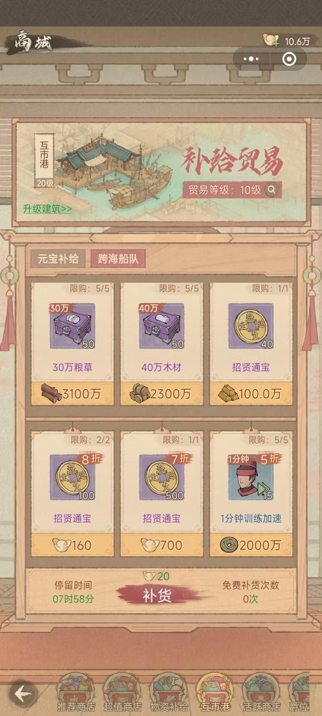 商品选购优先级指南1. 必买(无视折扣):- 金砖:升级城墙等核心建筑的关键,优先级最高。- 紫色/红色/橙色品质书籍礼盒:直接购买。2. 按需购买:- 玄铁锭:仅当主力僚属武器未满30级时补充。- 星辰石:按实际需求购买。3. 折扣好再买:- 建筑/课业加速道具:仅建议5-7折时入手,8折以上性价比低。- 招贤通宝:8折以下可直接购买。僚属是平民和微氪最缺的。没办法每日18的情