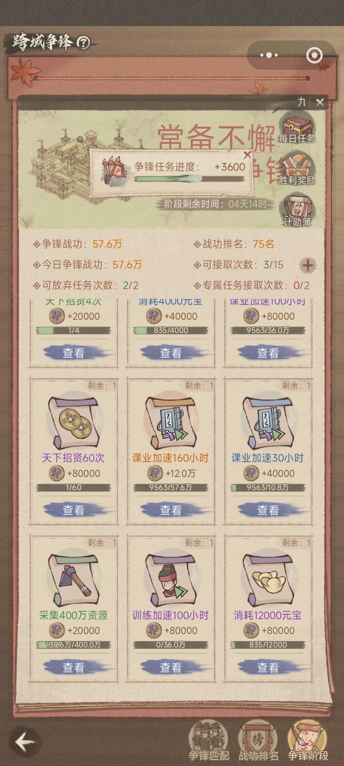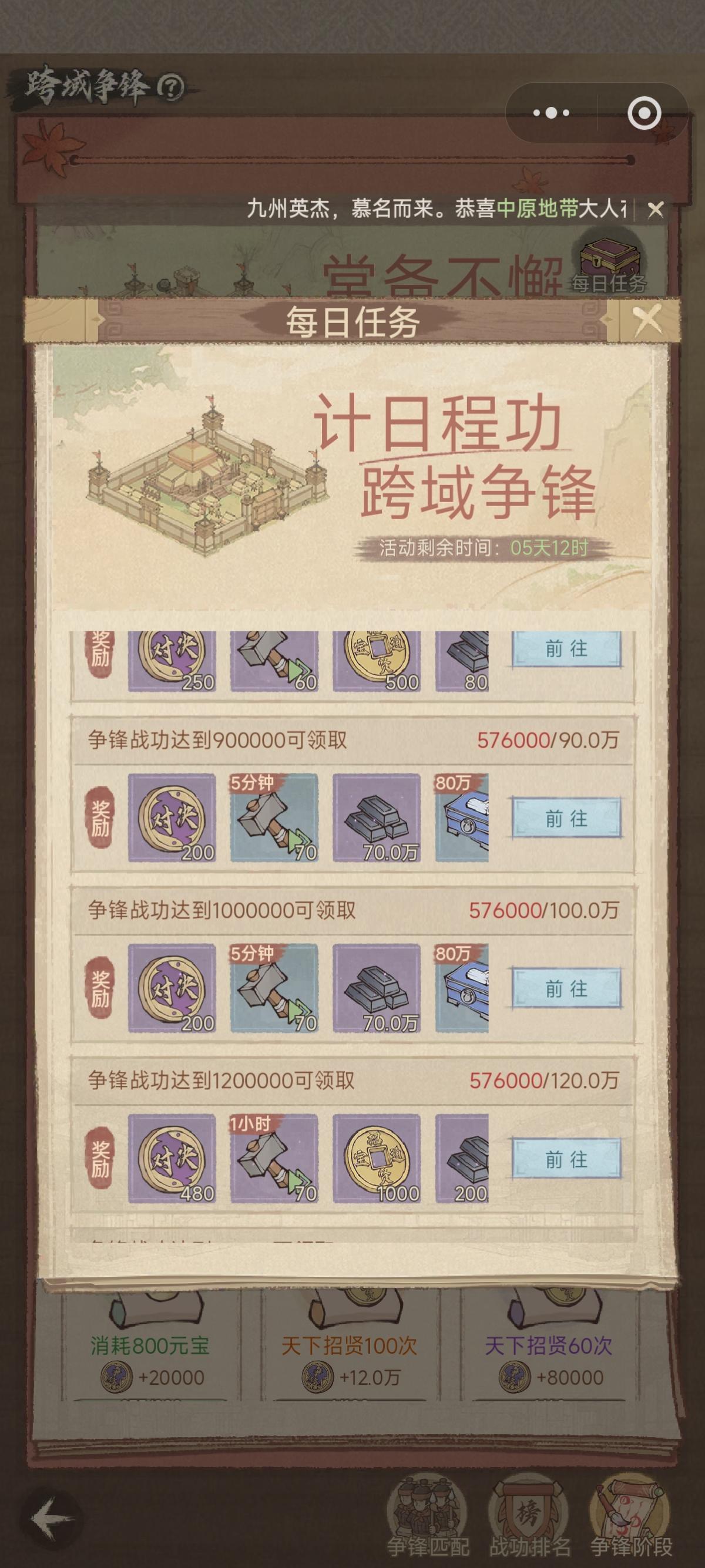 一、争锋每日战功完成目标本次跨域争锋任务难度升级后,核心目标锁定每日80万战功档,确保拿满该档位基础奖励(对决币、招贤通宝、加速道具等),同时最大化利用任务次数与资源,避免无效消耗。核心原则:优先清无消耗/低消耗高收益任务,预留关键次数给高战功任务,专属任务精准刷新,资源消耗任务按需补档。二、任务优先级排序1. 叛军清缴任务:无资源消耗,战功稳定,有多少做多少,优先清空;2. 采集任务: