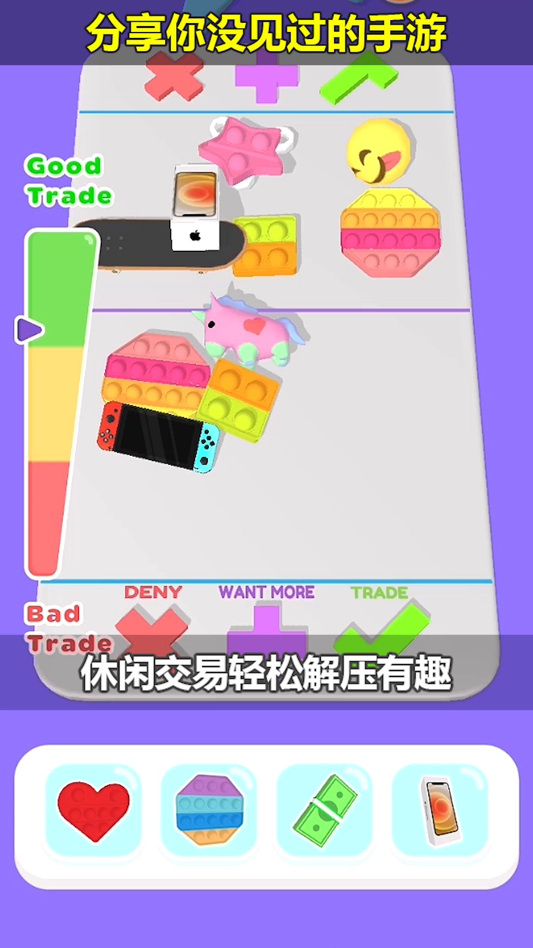 《Fidget Trading 3D》(指尖交易3D)是由magicLab推出的交易题材休闲益智游戏。玩家在游戏中借助简单的规则,掌握对手的心理,借助玩具展开各种交易。游戏中提供了超过200种不同款式的各色玩具,玩家需要在关卡中通过组合不同
