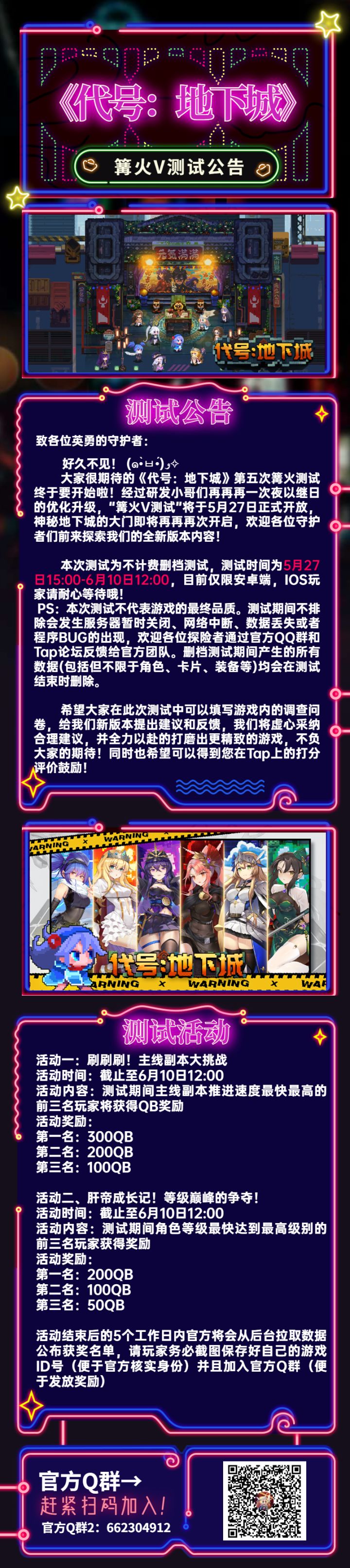 致各位英勇的守护者:又见面啦! (๑•̀ㅂ•́)و✧大家很期待的《代号:地下城》第四次篝火测试将于今天浅测一下!经过研发小哥们再一次夜以继日的优化升级,“篝火Ⅳ测试”将于3月10日正式开放,神秘地下城的大门即将再次开启,欢迎各位守护者们前来探索!本次测试为不计费删档测试,测试时间为3月10日11:00-3月13日12:00,目前仅限安卓端,IOS玩家请耐心等待哦!PS:本次测试不代表游戏的