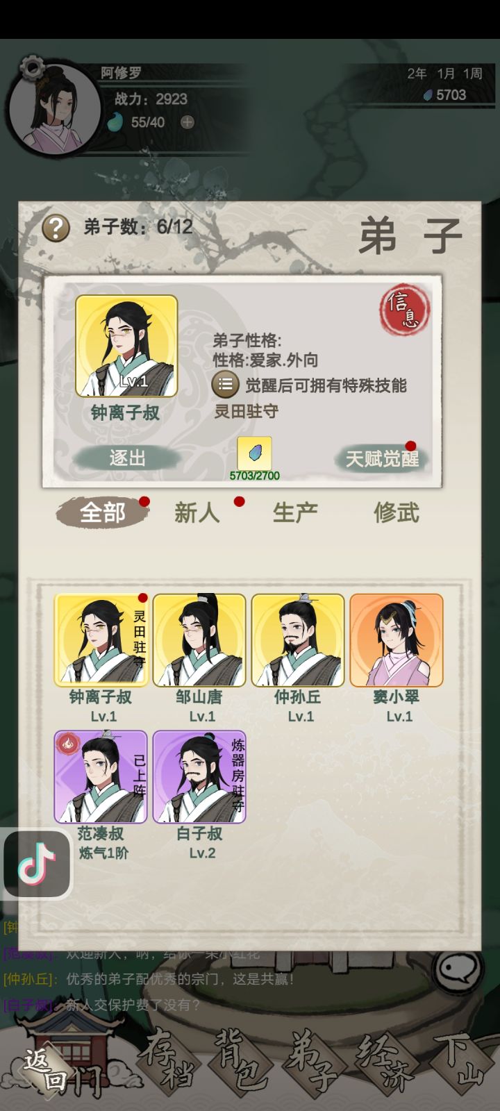 开局你就刷双天(双金)武修弟子,尽量按自己想要的天赋刷,这是个很漫长的阶段,目前版本,火掌门开局的多,就别想太多,刷修武阴,冰,雷,后面来多个修武天赋金的,没事,当工具人养,打秘境是关键,注意,武修目前版本养四个就够,必须双天