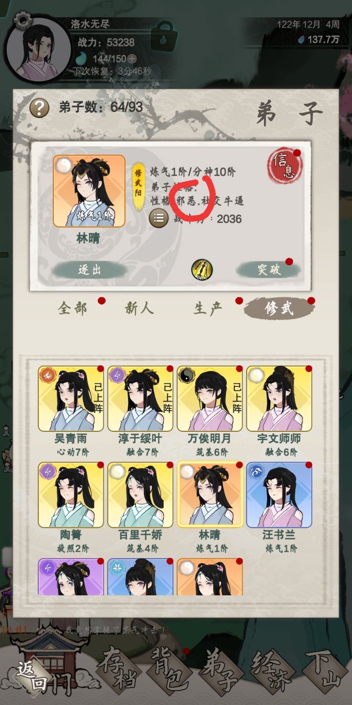 由于修武很重要,所以前期大家可以招募一些地极弟子刷天级修武天赋,然后用洗髓丹把弟子升成天级弟子,这样一个天级修武弟子就完成了。至于一般的天级弟子还是尽量刷到金就选吧,毕竟一直用沉默丹刷修武天赋的话成本比较高,不如用地极弟子刷天级修武,再将地极弟子升成天级。