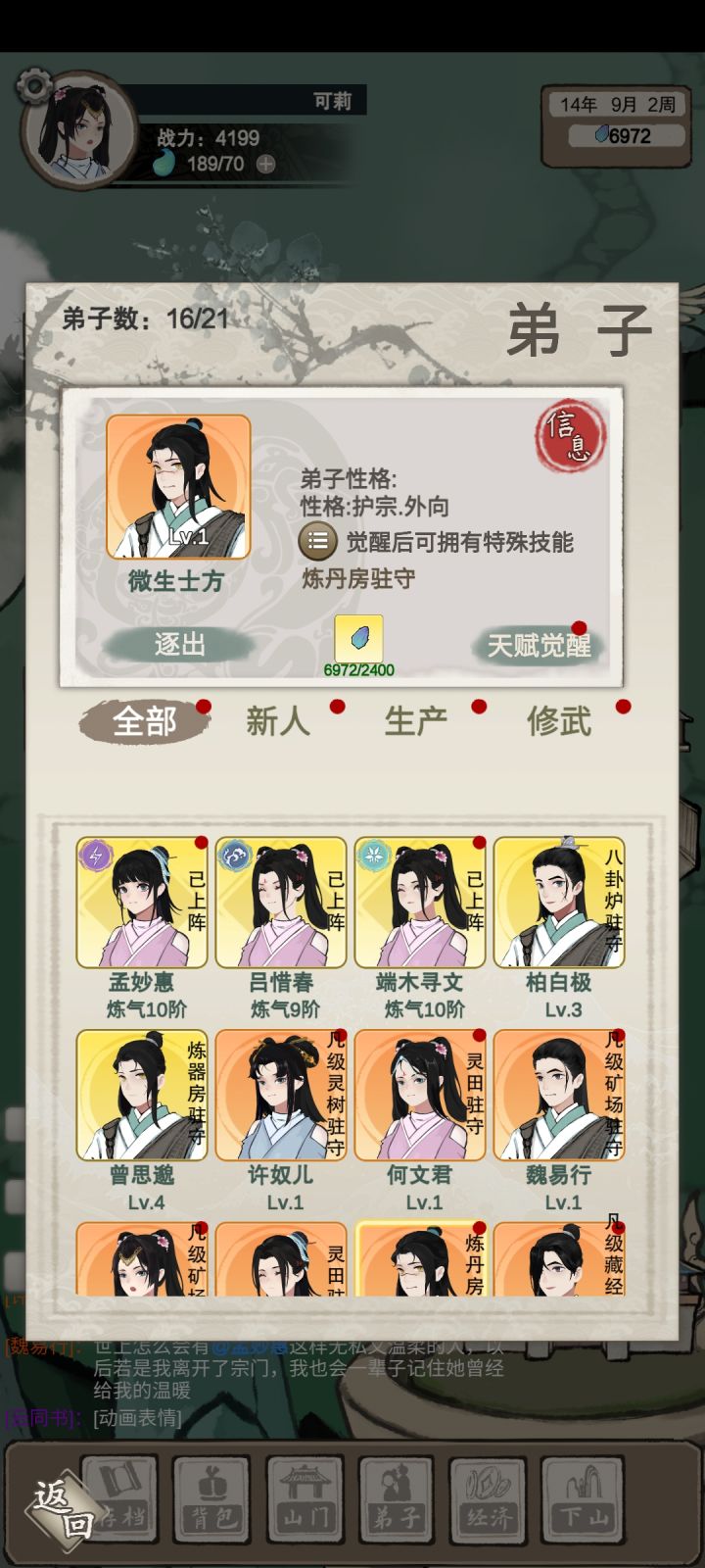 可能有人不太了解这游戏的品质,从高到低,金色,橙色,紫色,蓝色,绿色,所以弟子和天赋最好都刷成最高也就是金色的,前期先别管是什么,反正是金色的就选。