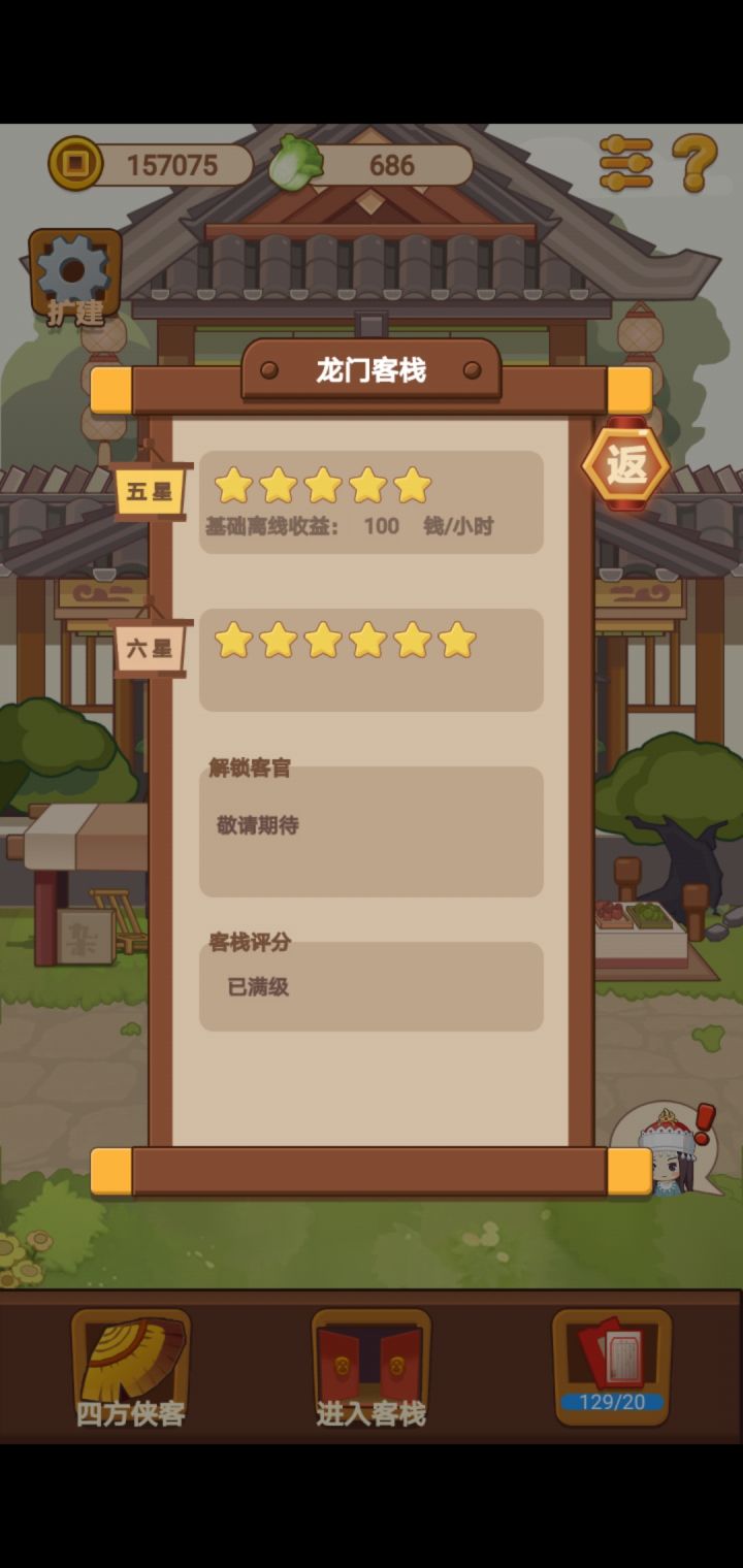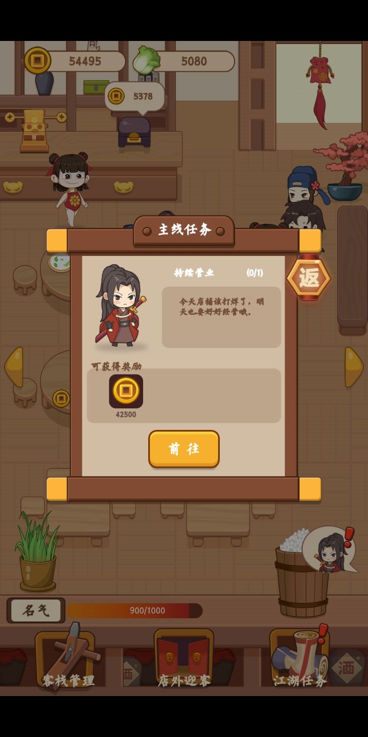 1、跟随着引导完成任务,店铺就升级到2星。2、接着在厨房内升级一波菜品,把菜品都升级到仙品。看看广告可以迅速升级,不用等。3、开通客房之后,先购买一套装备。床、茶桌、蒲团、梳妆台、棋盘。4、菜品、桌椅、客房装备都准备好了之后,是时候去店铺门口发帖招揽客人了。要是有钱,可以购买一个 红薯的伙计帮你招揽客人来吃饭 和 休息娱乐了。5、在客房内,客人给予铜钱以外,也会随机给予一些珍藏品,赶紧收集