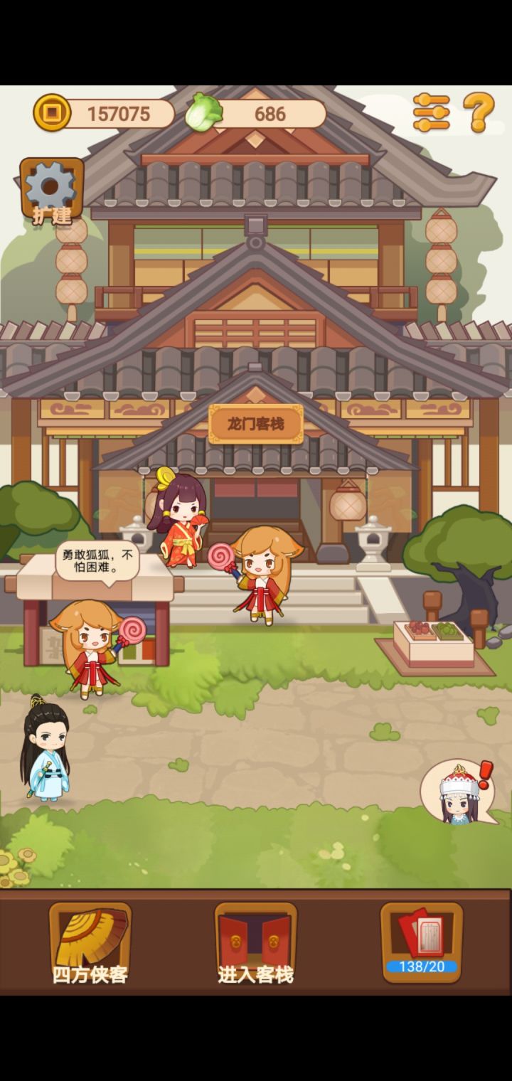 1、跟随着引导完成任务,店铺就升级到2星。2、接着在厨房内升级一波菜品,把菜品都升级到仙品。看看广告可以迅速升级,不用等。3、开通客房之后,先购买一套装备。床、茶桌、蒲团、梳妆台、棋盘。4、菜品、桌椅、客房装备都准备好了之后,是时候去店铺门口发帖招揽客人了。要是有钱,可以购买一个 红薯的伙计帮你招揽客人来吃饭 和 休息娱乐了。5、在客房内,客人给予铜钱以外,也会随机给予一些珍藏品,赶紧收集