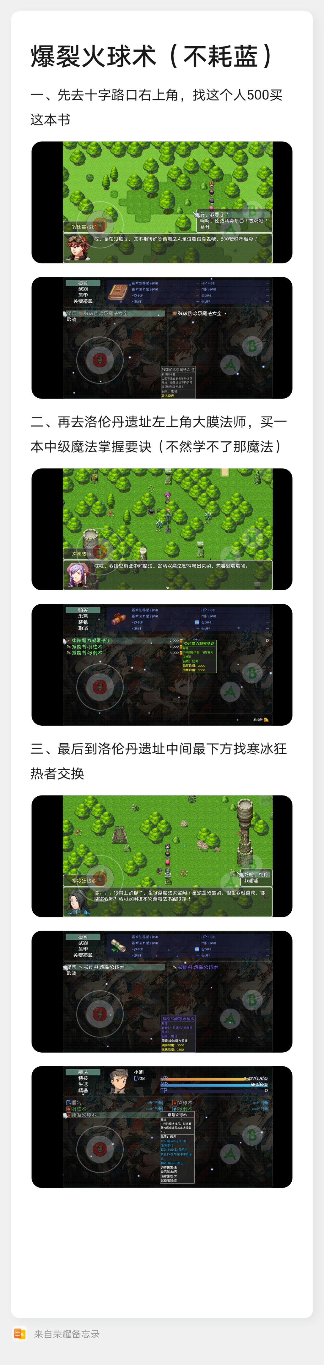 (以下所需要的魔法书魔法掌握等都有一个使用顺序) (主要的内容就是,使用一个中级射击可以选中所有队友,可以同时学习一个魔法,达到一本4用的效果) 我也是参考各位大佬的操作进行的! 1.去十字路口图右上角500金买下(残缺冰系大全) 2.十字路口图👇方打石头,有魔力中级掌握跟爆裂火球,进图往下遇得到冰系热爱者(换得一本爆裂火球),进图左边第一个遇得到中级魔力掌握2000金一个队伍一人一本 3.回去十