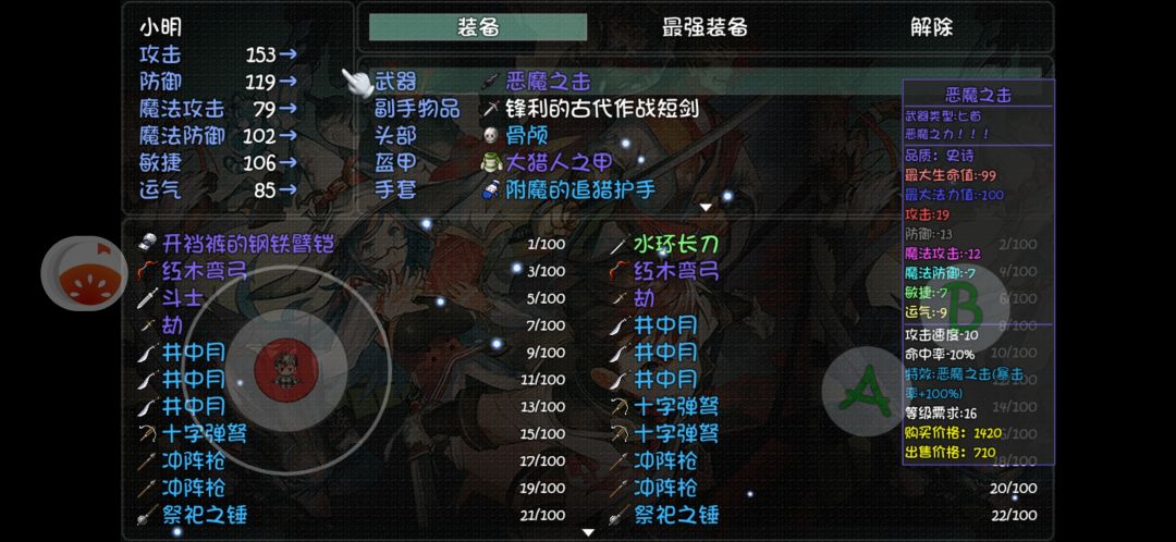 实测了两个小时测出来的。。 这里先说一下我的推荐:魔王,暴力狂,冰冰,帅哥,凶猛,冬天,会,扶,财富 这样主要加点物理,适合开局,同时还能拿小红 毕竟这些选项都没有加百分比的,后期一点两点属性并不算特别重要,主要还是应该侧重开局 没有任何加成的属性是450点生命200点法力值,其余各项为15,百分之九十五的命中,百分之五的闪避和百分之四的暴击 选择魔王加一点物防,其余无效果, 如果选择屌丝还会获得