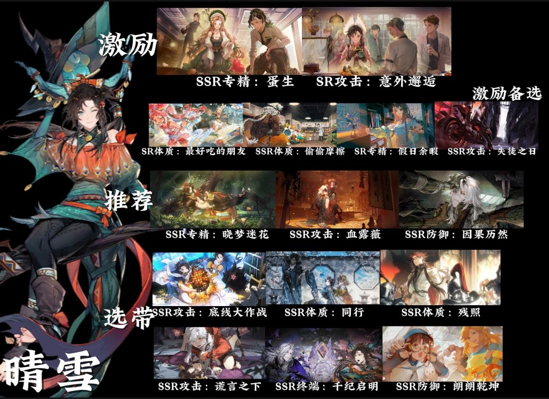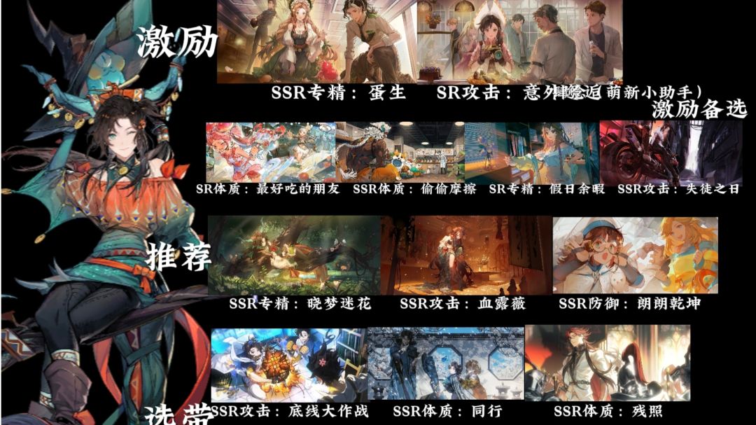 个人见解 同行首先是首选卡 激励:蛋生+意外邂逅 这里以白鸟梓作为队长,为什么激励没有方块?风队激励基本没有方块卡。 其余四张激励卡:没有排名,个人感觉都差不多 其他:伴生烙痕晓梦迷花+血露薇+朗朗乾坤 这里给的推荐比较多,因为造价比较高,新手不太能全配。 剩下推荐的:底线大作战/同行/残照 谎言之下+千纪启明增加召唤物伤害,小技能对白鸟梓有帮助。 其他的防御卡选择:双重引力>因果历然 带了朗朗乾