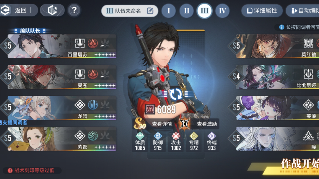 这篇不能算攻略,算是一个监督的挣扎过关。 不养火队但自选选了昊仓,还执着于通关金色头像。 侧面试了试t0角色不赶时间,血量和输出都是能打一整场boss的。 试过景和比戈尼娅,输出形式上没多大区别,都是昊仓续航cover场面。索性换了焰响【减炎抗+抗打】,都是磨血,一视同仁。 在卓越道路里,尝试随意组合叭。