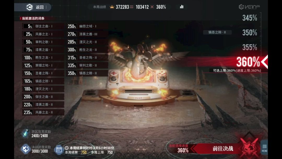 360%还没开,试试330%的难度。这个boss血量很厚,且很多高伤害的aoe,既要保护同调者又要守护终端,打起来确实有难度。 对于非水雷队玩家来说还要考虑换人清除场景内火地板(boss免伤机制),于是试了下平民/新手玩家比较适用的阵容——三角蚀队,发现五星战神卡洛琳还能c(*˘︶˘*).。.:*♡ 配卡方面,低配可选择:棺中鸟换因果历然,烟尘往事换千灯无间。激励卡可选海林人、繁花蜃影、暗巷,推