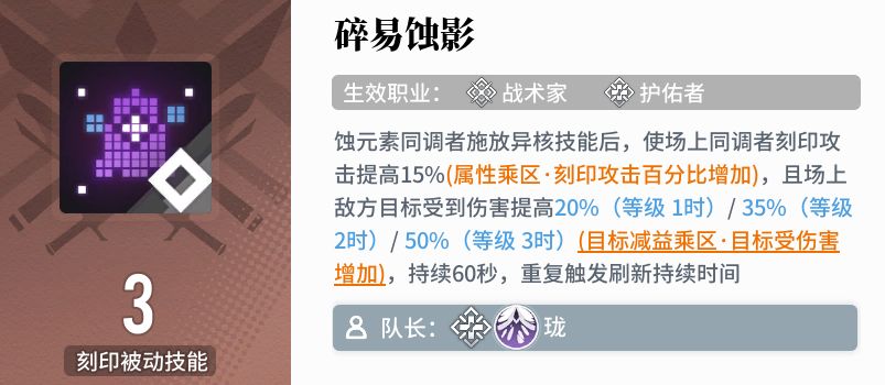 队长技 15%刻印攻50易伤,美汁汁 技能 1技能伤害+治疗,资源紧缺的推荐只点1级 2技能回转、异核充能,建议点满 大招伤害+清投+治疗+爆伤 蚀队:暴击+攻速,利好明月尘 非蚀:攻击+穿防,挺不错 命座: 1花大招15s-25s,队长暴击率+25%,利好明月尘队长 3花全抗15%-20%,基本不考虑1350终端,所以看成15%减全抗即可 大招的加成随命座提升而提升,因此也算是命座战士 爆伤:3