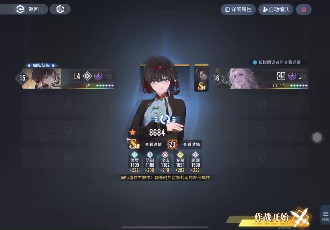 有两周没认真跑蚀队烙痕,抽空跑了一个,就当看看珑妹加入对明月尘的提升吧。 配卡: 双终端:镜中+千灯 激励:奢梦攻击+专精蛋生【治疗是吃专精的,这两都能直接作用于珑妹】 体质:同行【方块必带】 防御:因果【主线+凑到满破啦】 手感体验: 明月尘和珑妹都能远一点,躲着输出,珑妹有点点手短,两只的技能输出打三角炸弹都很香。 珑妹奶量不错,试过一局,让明月尘站着挨打,不躲避,全程让珑妹补血,即使被锁跳攻