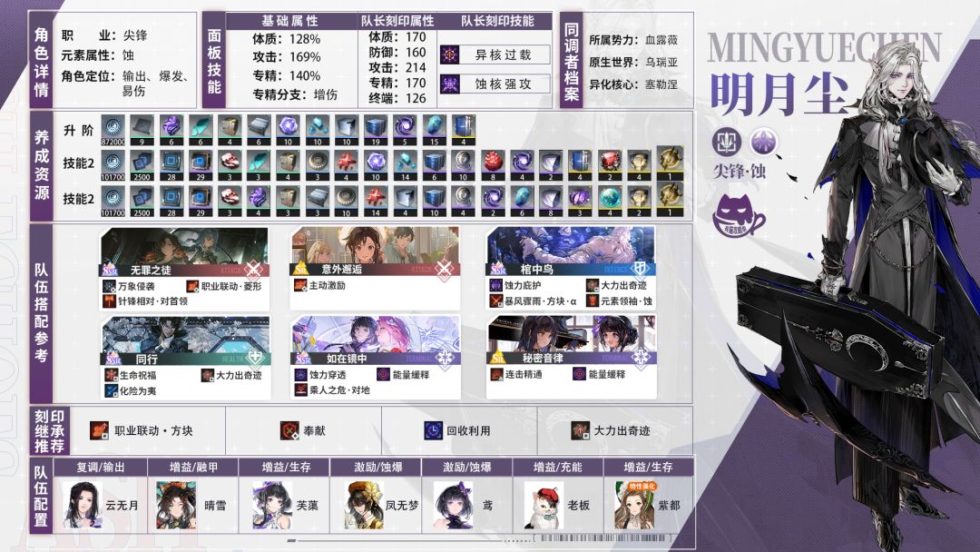 全新的大招无CD机制,需要靠技能提供特别的能量,攒够能量即可释放大招 自身进入自动技能的强化状态时可快速叠加能量 自带高额易伤的领域,配合大招打出爆炸输出 配队的尽头是尖锋,核心成员明月尘、云无月、晴雪,芙蕖或紫都 融甲易伤增益爆发应有尽有 后备小鸢开局快速蚀爆,加速蚀爆叠攻时间,烙痕带音律则再上个凤无梦 其他带工具人,老板比戈都可以。 完整烙痕推荐:无罪之徒、意外邂逅、棺中鸟、同行、如在镜中、