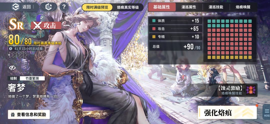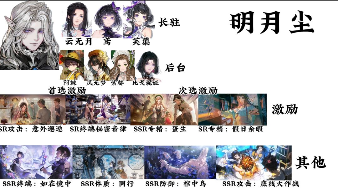 激励 首选SR攻击大月卡烙痕意外邂逅,用阿棘和芙蕖叠激励 秘密音律:游徒位叠激励 次选可以选择『蛋生』或者主线任务赠送的『假日余暇』 但是『假日余暇』偏向菱形队,没有『鸢』换『阿棘』可以选这个。 其他四张选择 SSR终端:如在镜中,主要提升鸢的伤害 SSR体质:同行,提升明月尘和云无月 SSR防御:棺中鸟 SSR攻击:底线大作战,吃大技能45%攻击加成 其他备选记忆烙痕,以上首选激励一张都没有的,