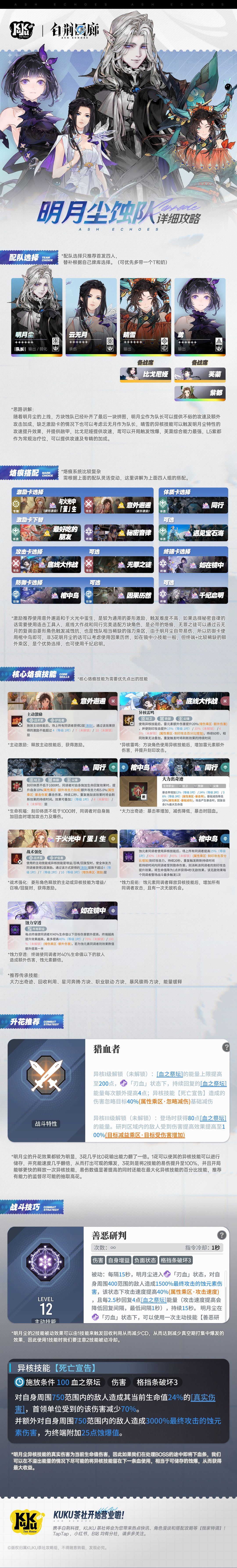 省流: 明月尘3花或跳过,主2技能刚需回收利用 明月尘3花:棺中鸟满破 明月尘0花或跳过:棺中鸟开图鉴或跳过 明月尘简析 队长技 相当适配自身,卡洛琳、凤无梦大招没有伤害无法触发 技能 1技能聚怪,加资源条 2技能加攻速,加资源条,回血,范围易伤 大招一次类蚀爆,再一次蚀伤害 特性消耗血之祭坛即额外资源条放大招,大招充能效果变为加20%攻速 简评:技能与特性互相联动,通过放技能和被动来获取额外资源