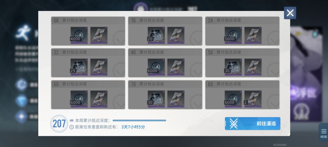 一、漫巡路线 总共3大块、8条路线:万象(实验室、血露薇/市区、海临街道)、蜃楼(意识幻城、战乱地区、空想王国)、浮世(福利院、永昼之庭)。 路线长短排序:万象>蜃楼>浮世,刻印等级收益与之相同,大致如下: 在烙痕满级,两张满破的情况下,万象A29-S31、蜃楼S30-S33、浮世S36-S38。 我的目的:刷基点技能+跑不常用同调者(培养默契)+提高实验室等级(换一点抽卡资源)。 从时间成本考虑