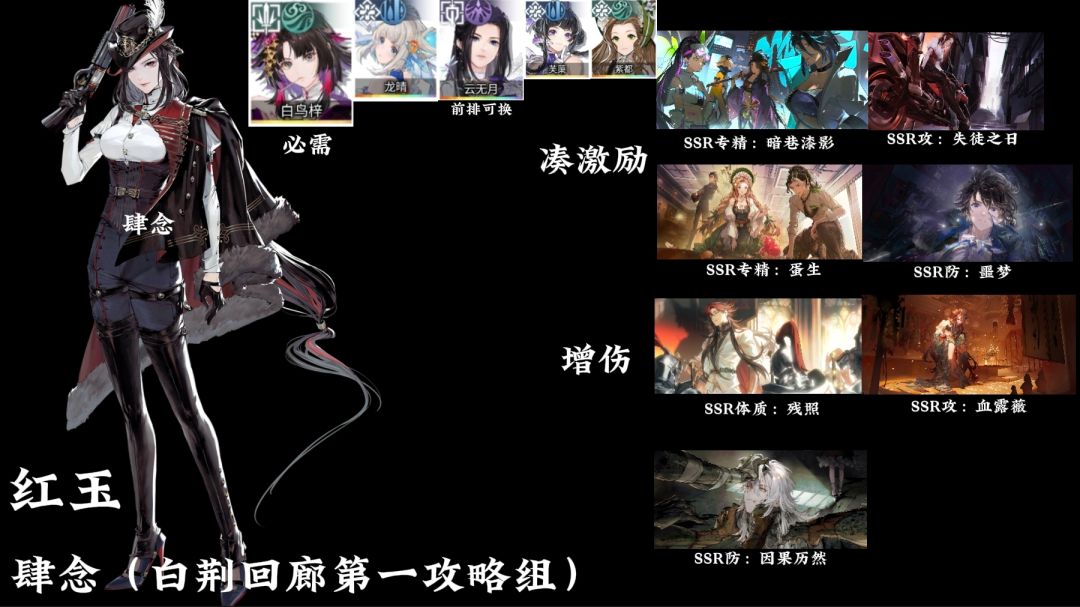 细节🤏:红玉配队和白鸟梓绑定,没有白鸟梓就不推荐玩 龙晴位:龙晴作为奶妈位可以用芙蕖或者紫都代替(没有奶妈位/战术家【增益/召唤/回复】就不能带SSR记忆烙痕“于火光中蛋生”) 前排位:不是云无月必需,需要一个前排,比如“莫红袖”“禺期”这些铁御也可以用 ————————————————————— 接下来是激励:暗巷漆影真的很百搭,万能 有条件带“失徒之日”就抽,漫巡技能对伤害也有提升,主要用来凑