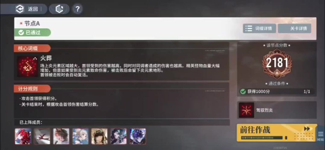 一、A节点-织雪 1.机制分析(以03节点为例) (1)伤害计算:以攻击首领的伤害值计算分数。 (2)得分要点:依靠扩大火地形来对首领造成伤害。 要么是同调者,自身可以铺火地形。 要么是依靠炎元素伤害对精英怪造成最后一击,怪物死亡后留下火地形。 (3)队伍选择:只能选火队。 (4)自选增益:驾驭烈炎。 依靠炎元素产生的各种元素反应,能达到最高100%的攻击力提升。 推荐:尽量选择火雷爆燃反应,不产
