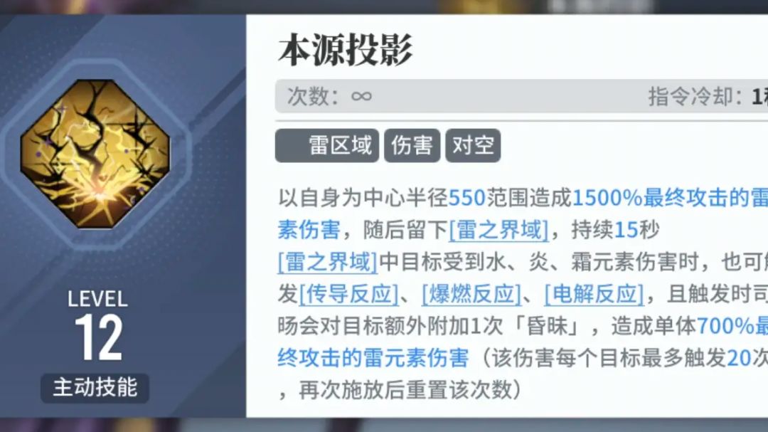 司旸的二技能可以说是司旸最核心最特殊的机制。司旸释放二技能可以生成一个雷元素区域(雷地板),拐与输出一体。 雷之界域视为雷元素区域,区域内的目标受到水、火、霜元素伤害也能触发相应的反应,触发时司旸会对目标施加一次昏昧,造成雷元素伤害。 文案说长不长,却暗藏玄机。先说司旸二技能的注意点: 1、昏昧没有冷却,只有次数上限,可以通过高频元素攻击,快速触发昏昧造成伤害(比如卯绒绒一技能、莫红袖的二技能等等