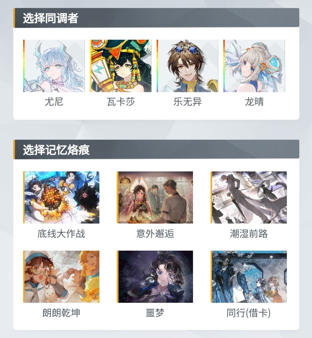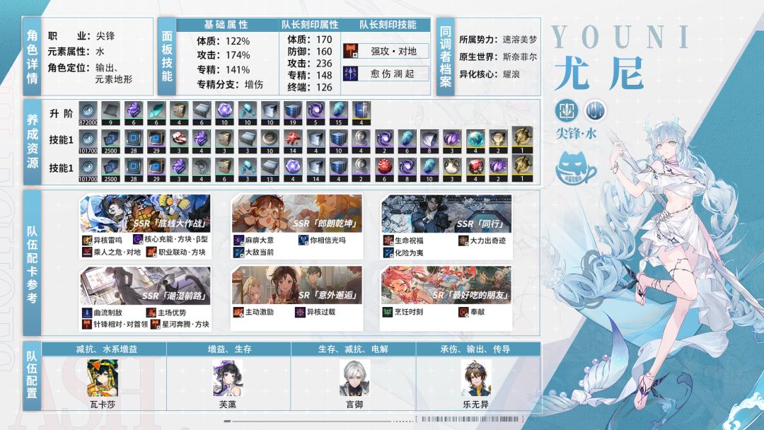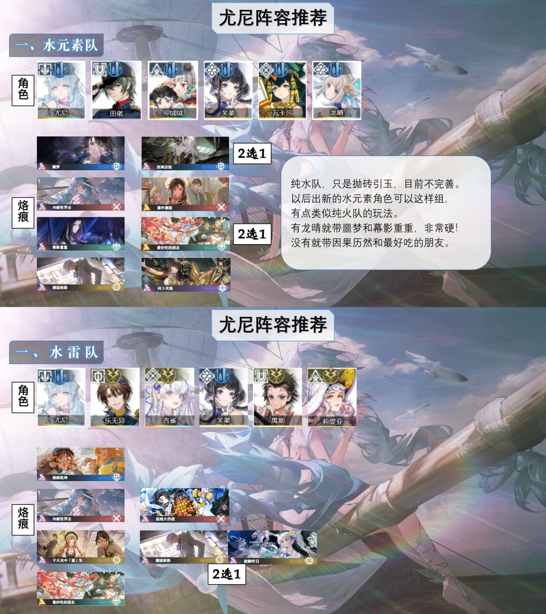 图①为完成体配队 图②适合回归玩家和新手玩家 尤尼定位水系先峰,可c可辅,暂无配队的新手玩家可以前期自选水雷队【禺期+司危+瑶瑶】,插入尤尼作为输出和破盾手,常驻六星自选先选【龙晴】替换瑶瑶,有【瓦卡莎】可以替换掉司危。 烙痕选【噩梦】,然后借大佬的【于光中蛋生】这样就能叠满白荆最重要的20层激励增益乘区。其他烙痕卡用主线增送以及活动商店和当期Up的烙痕卡。 老玩家有足够强力配队可以抽一个当