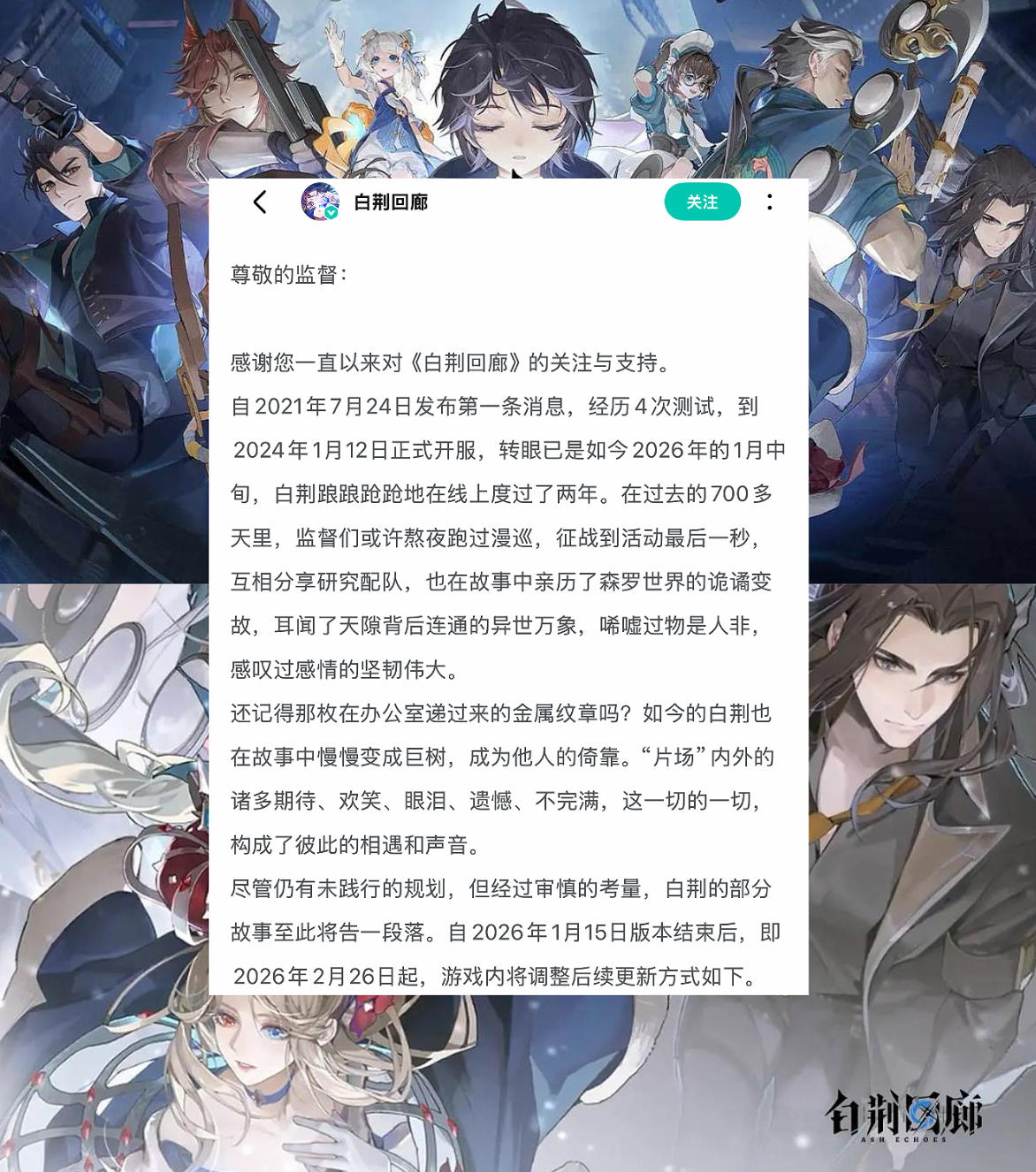 小菜哥我是万万没想到啊,《白荆回廊》也撑不住了。就在刚刚,网元圣唐旗下上海烛龙自主研发,腾讯发行的二次元游戏《白荆回廊》官宣停更。官方公告称,自2026年1月15日版本结束后,即2026年2月26日起,停止精神深潜中全新同调者「定向共鸣」的开放,全新版本的周期性更新也将暂时停止,过往限时活动将继续进行复刻常驻。官方在公告中表示:“我们深知这一系列调整和缩减并非监督们期望获得的答复,但在如今的