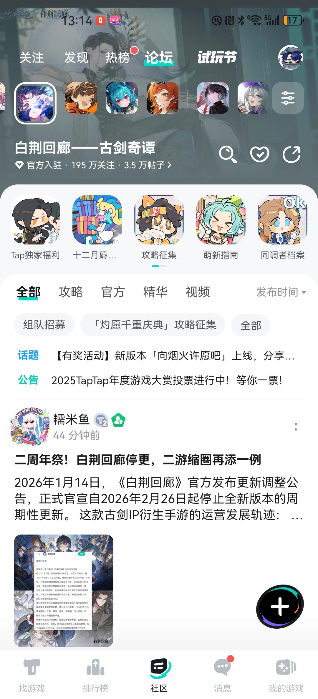 大的来了家人们!就在今天1月14日 2026年首款停更的二游来了!网元圣唐旗下上海烛龙研发、腾讯发行的《白荆回廊》,官宣要停止更新了,消息一出,瞬间冲上热搜!社区讨论热度爆炸! 官方公告表示1月15日这个版本结束后,从2月26日起,就不再定期推出全新版本了。不光如此,新角色的「定向共鸣」抽卡活动不会再开,还有「故事历程间章·朝露世」的剧情内容,也彻底停更,没法再跟大家见面了。 这不就说明游戏