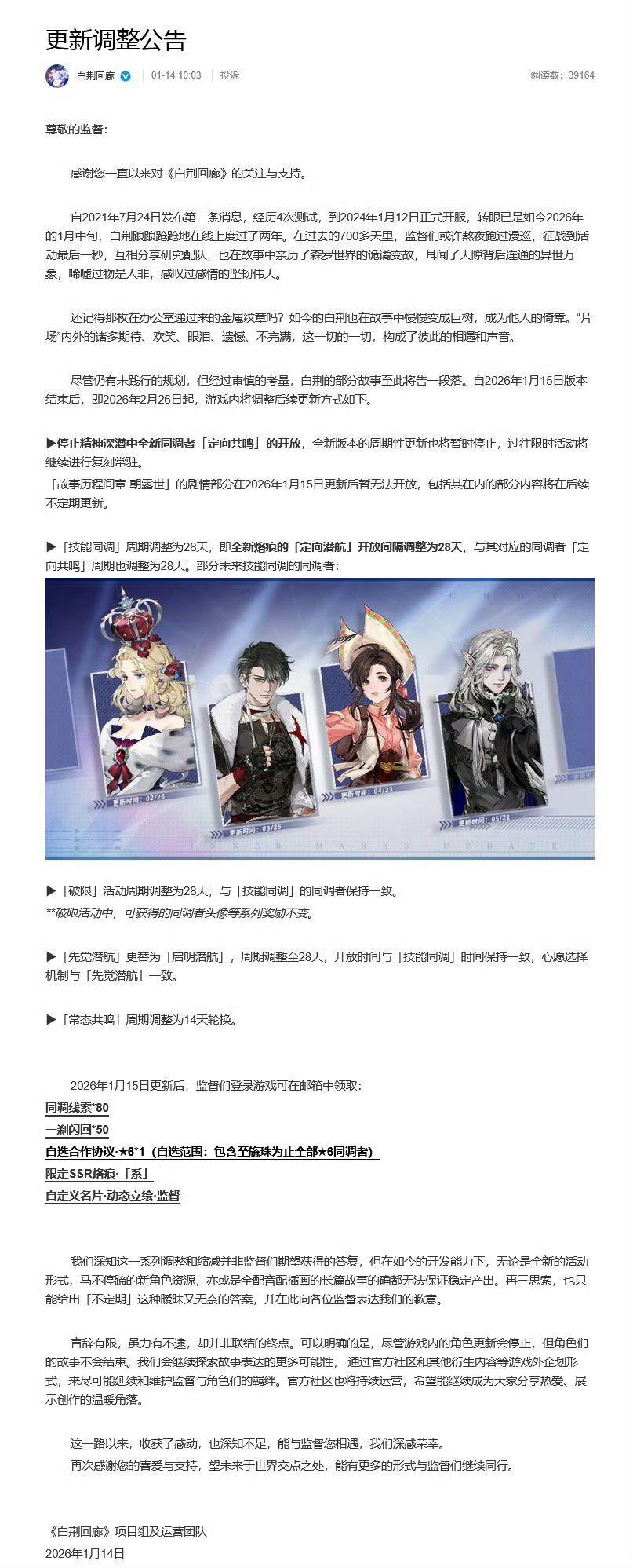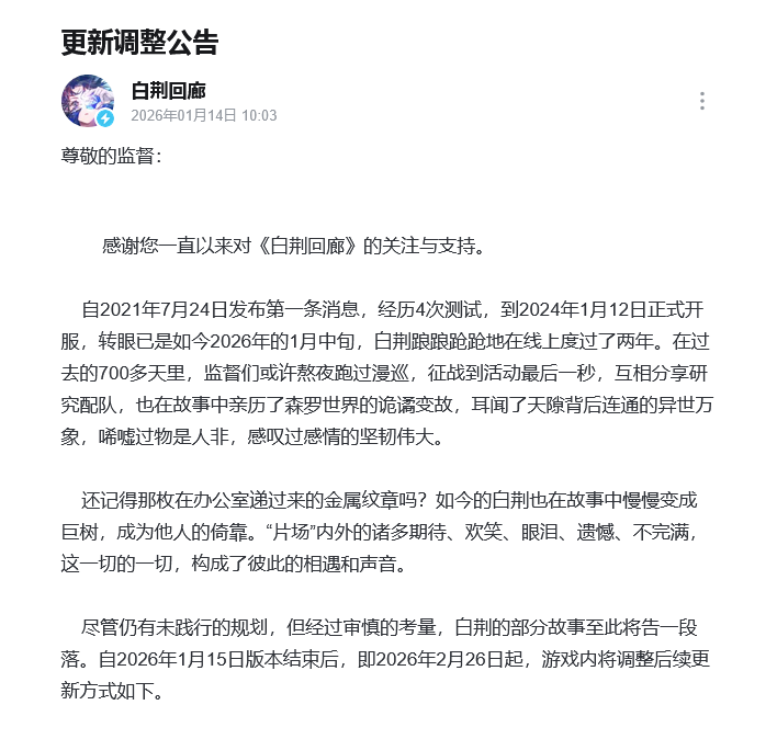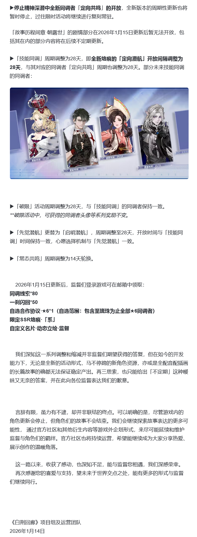 2026年1月14日,《白荆回廊》项目组及运营团队宣布,游戏将于1月15日更新后调整「常态共鸣」为14天轮换,停止游戏内新角色更新,同时向玩家发放多项补偿福利,后续将通过游戏外企划延续角色故事。补偿福利包含同调线索80、一刹闪回 50、自选合作协议·★6*1(含至旒珠为止全部★6同调者)、限定SSR烙痕·「系」及自定义动态立绘名片,更新后玩家可通过邮箱领取。「先觉潜航」玩法规则保持不变,此次调整