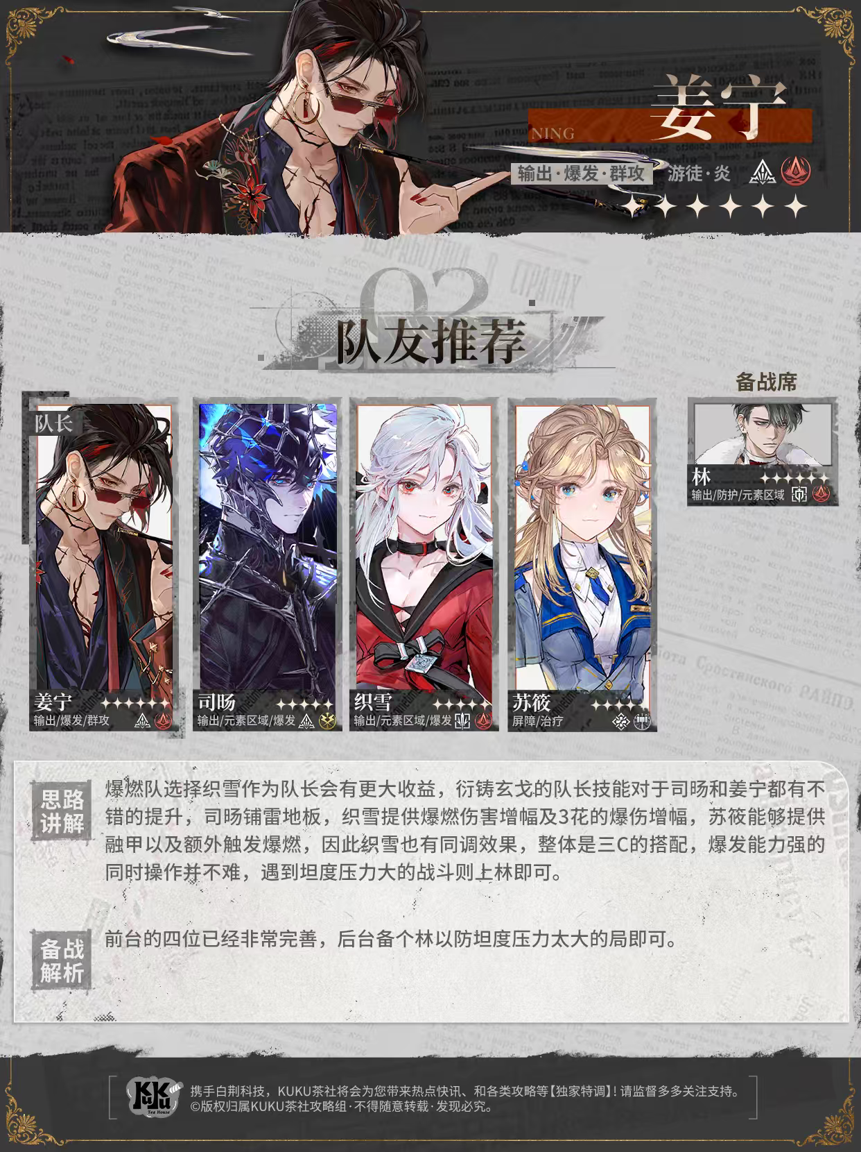 监督好呀,白荆回廊二周年来啦,本次实装的是我们血露薇老大姜宁~姜宁是一名六星炎属性游徒,主要特色在于血露薇花引爆带来的爆发能力以及附加燃烧效果带来的持续输出能力。姜宁的配队可以有两个反向,与司旸进行双C的爆燃配队,以及以自身作为绝对C位的纯火配队,监督可以视自己的BOX进行选择哦。▲本期整理:小电视📺ID: 霒婴怪▲本期美术:墨水*制作不易,严禁任何商业性转载及搬运,转载需标注攻略组出处