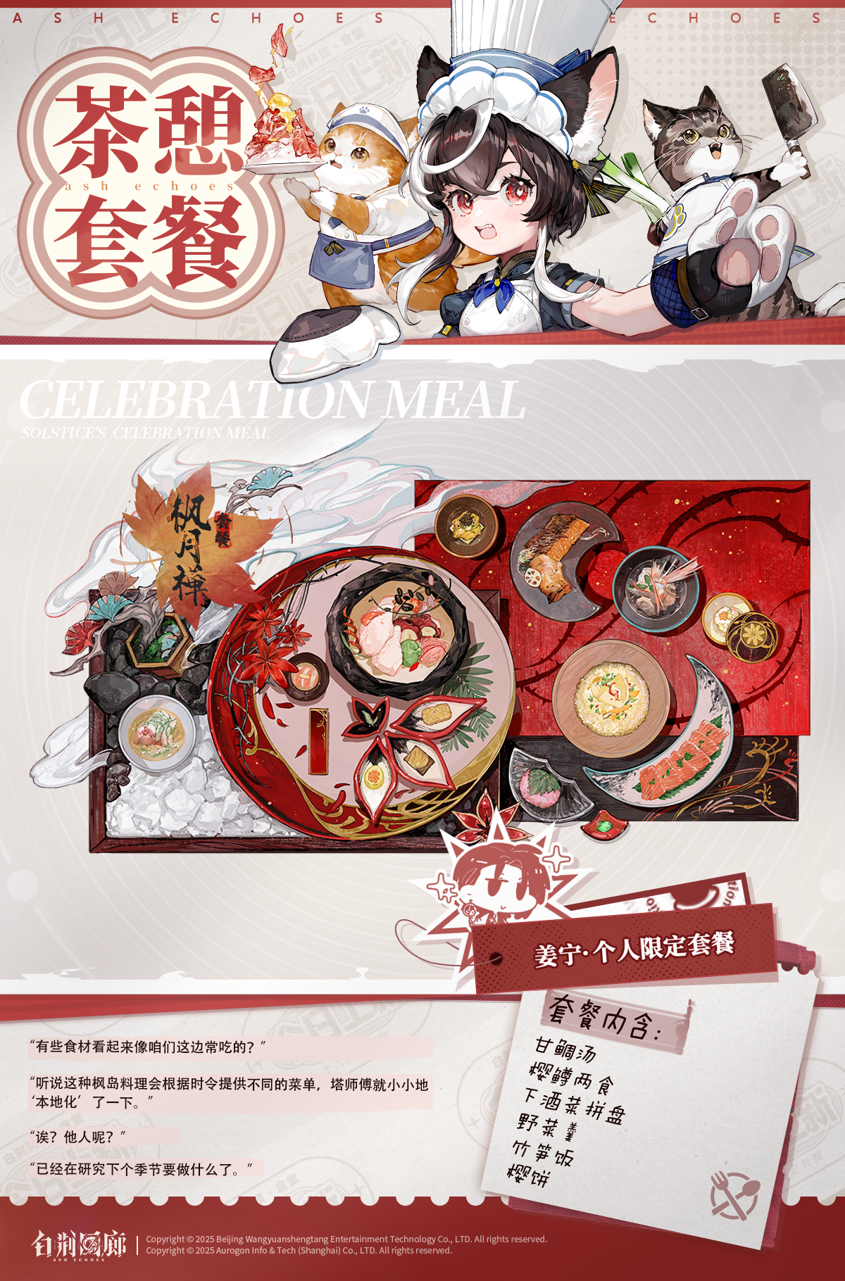 今日茶憩套餐:【枫月禅】套餐“有些食材看起来像咱们这边常吃的?”“听说这种枫岛料理会根据时令提供不同的菜单,塔师傅就小小地‘本地化’了一下。”“诶?他人呢?”“已经在研究下个季节要做什么了。”#白荆回廊