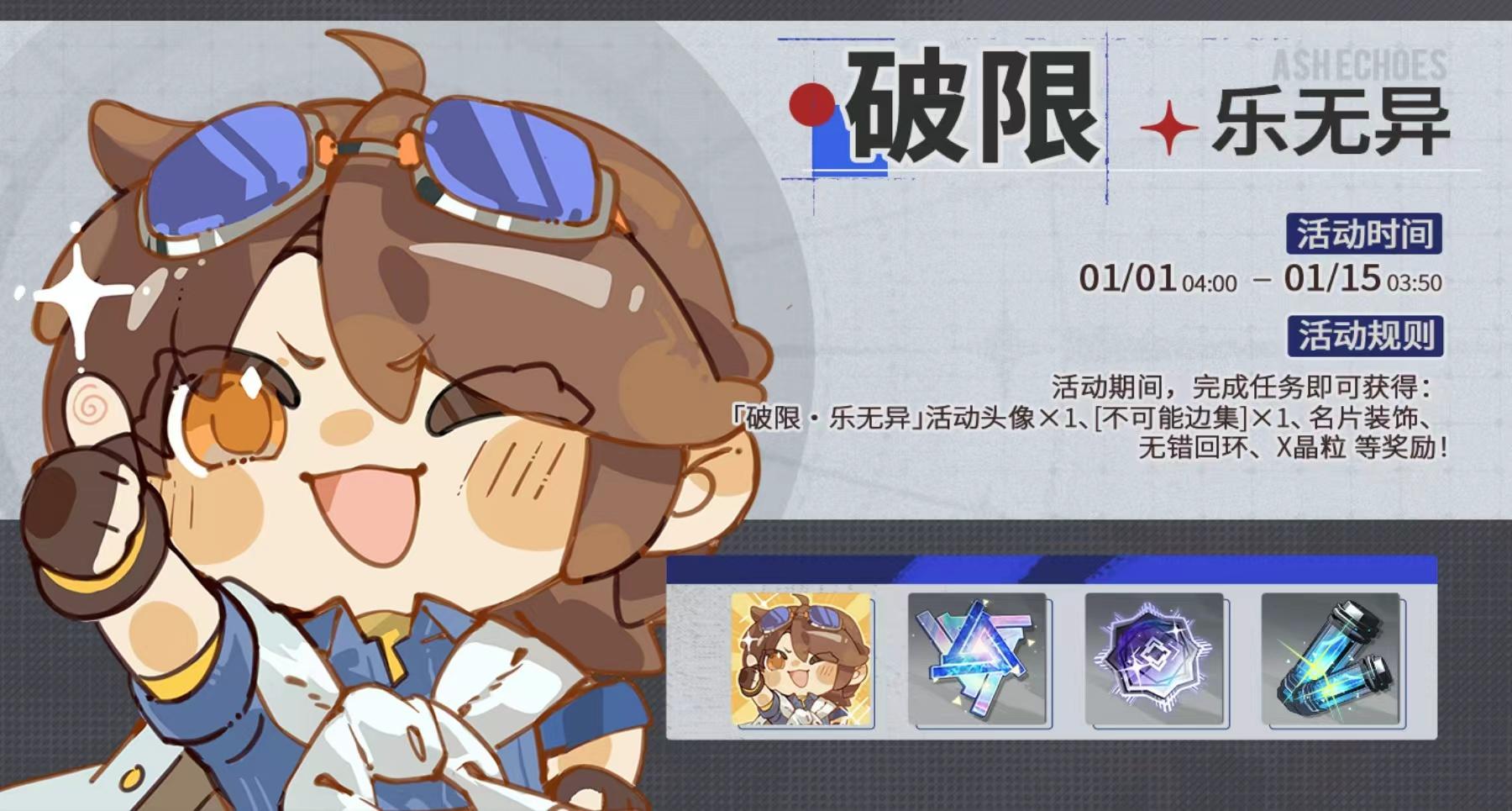 活动期间,监督完成任务可获得「破限·乐无异」活动头像×1、[不可能边集]×1、名片装饰、无错回环、X晶粒等奖励。▶活动时间01/01 04:00 - 01/15 03:50#白荆回廊