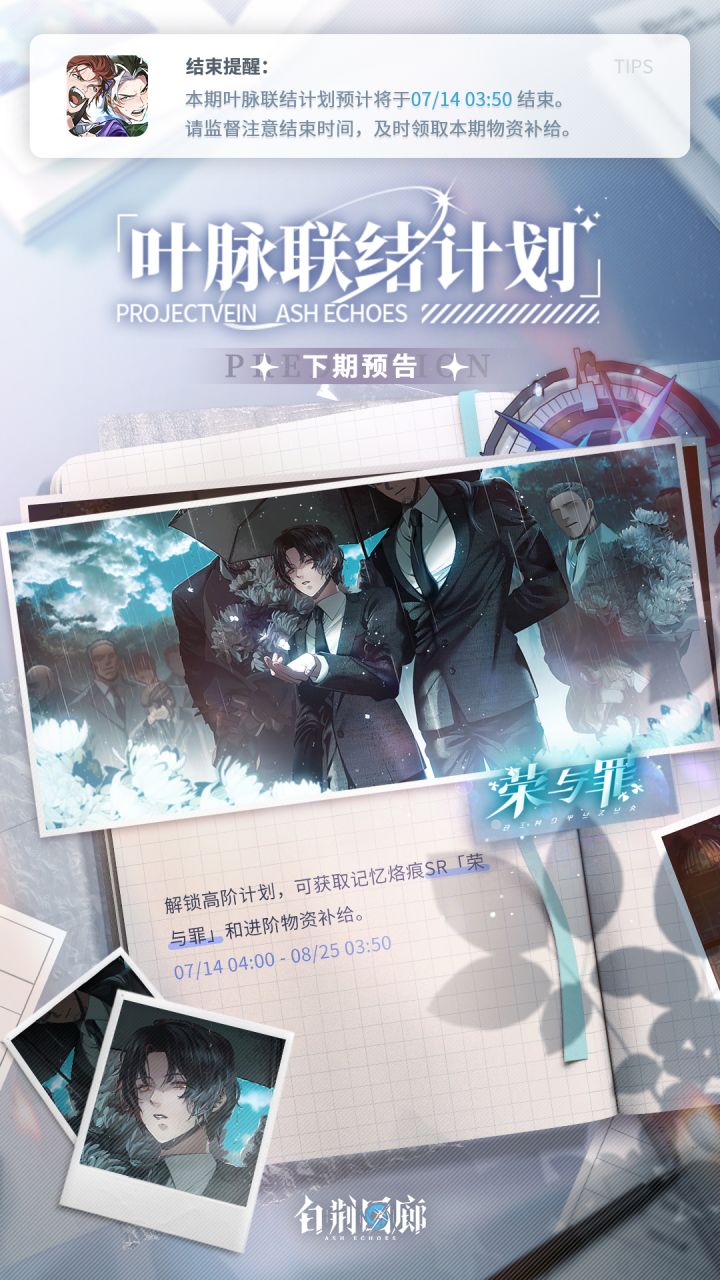 本期叶脉联结计划预计将于07/14 03:50结束。请监督注意结束时间,及时领取本期物资补给。▶下期预告※ 荣与罪※ 07/14 04:00 - 08/25 03:50#白荆回廊