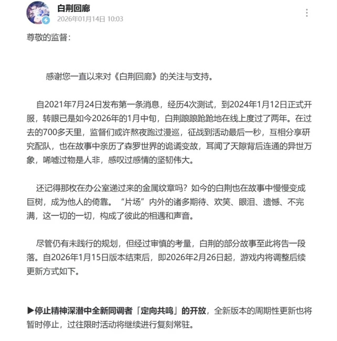 26年首款停更游戏!白荆回廊官宣停止更新!