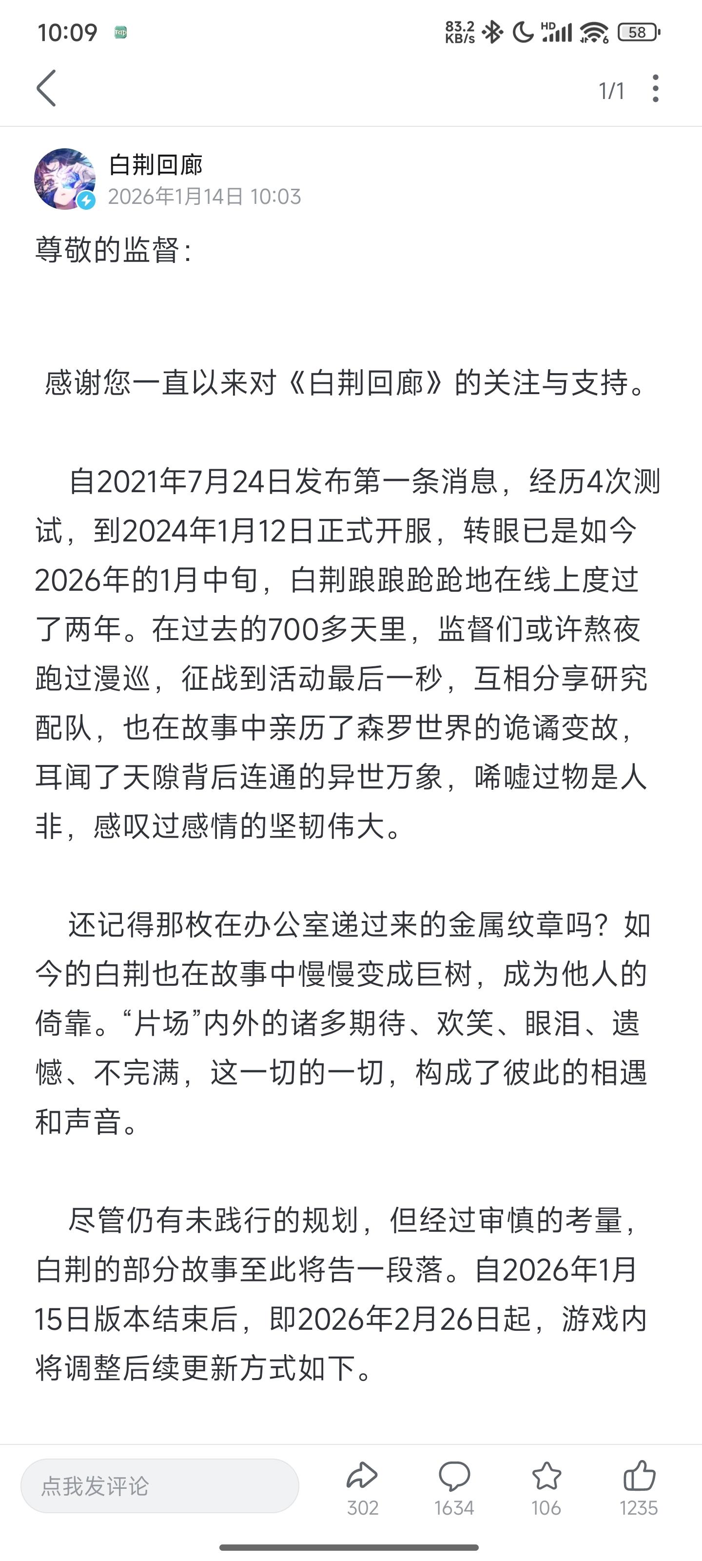 大的来了家人们!就在今天1月14日 2026年首款停更的二游来了!网元圣唐旗下上海烛龙研发、腾讯发行的《白荆回廊》,官宣要停止更新了,消息一出,瞬间冲上热搜!社区讨论热度爆炸! 官方公告表示1月15日这个版本结束后,从2月26日起,就不再定期推出全新版本了。不光如此,新角色的「定向共鸣」抽卡活动不会再开,还有「故事历程间章·朝露世」的剧情内容,也彻底停更,没法再跟大家见面了。 这不就说明游戏