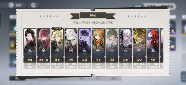 自选是十选一那个自选吗?你可以看看逸虚召唤队,十选一选北洛,带上芙蕖,剩下可以是另一个召唤队友(最优是米达斯/岑缨)or铁御/轻卫抗伤or尖峰破盾,逸虚大招真伤能在大部分关卡无视环境和debuff输出,直接血条消失术。北洛还有罩子防暴毙,定时件能嘲讽可以当半个前排,十分安逸。而且岑缨4月还要技改,估计强度还要往上走或者你也可以抽准备复刻的龙和,龙和和崔远之都是普攻三角C,双C增益可以一起吃