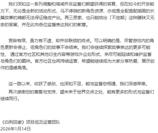 大的来了家人们!白荆回廊这回是真凉透了,这事儿直接引发玩家热议!最近官方还在接连发角色生日贺图,可角色更新却一点消息都没有,玩家早就纷纷吐槽这游戏怕是要凉。 虽然前段时间官方宣布了 从2026年2月26日开始,游戏更新要大变样,全新角色彻底停更,就连周期性的版本更新也不更了,之后就只复刻以前的活动角色。而且所有活动和角色武器卡池,全都改成一个月更新一次。 官方也直说,现在的开发能力跟不上