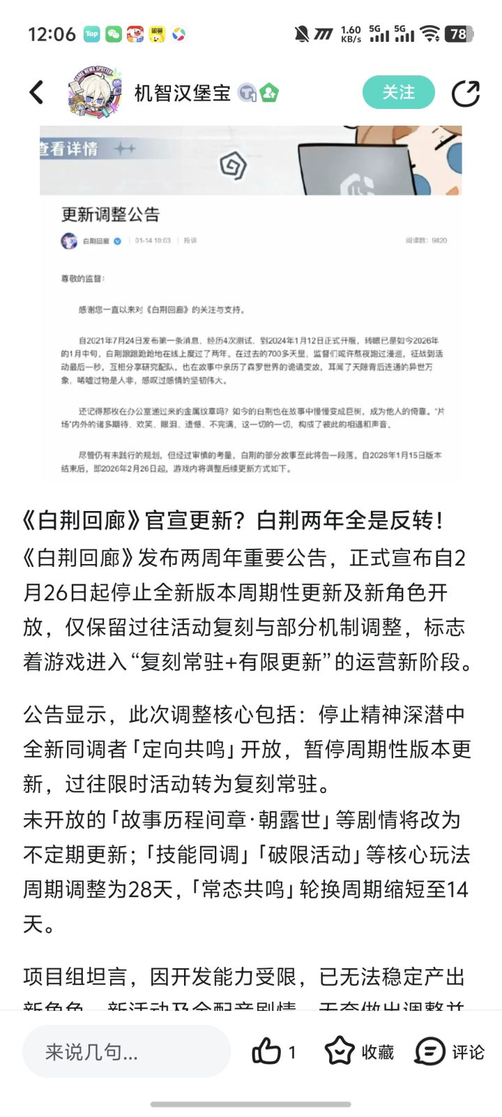 白荆的玩法确实吸引不到很多玩家,又复杂又难,制作组又不愿意向玩家妥协,而且运营做的不太体面,实质内容半年前就没有了,硬耗着玩家的期待值,团队最后的良心就是在两周年开始前一天发通告,让玩家更加理性看待最后一氪和存量资源。估计经常玩的大家都有点心理准备吧,一个游戏产能下降成这样就是很不好的先兆,大家都知道它可能药丸了,但是突然的来了还是有些意外的。#白荆回廊官宣停止周期性更新 #白荆回廊