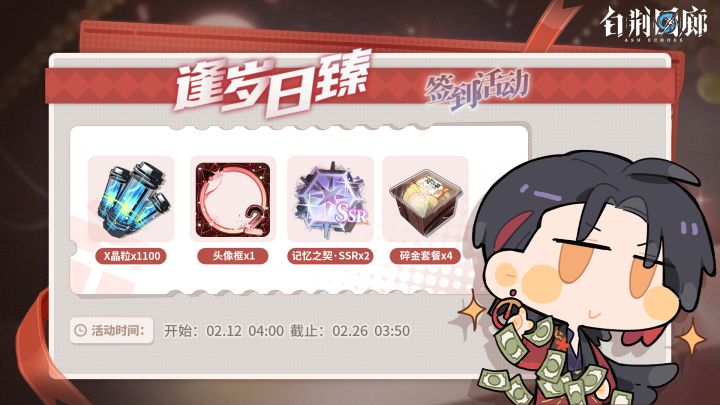 参与「逢岁日臻」限时活动,完成签到,即可获得X晶粒、头像框、碎金套餐等奖励。▶活动时间02/12 04:00 - 02/26 03:50▶活动奖励共计可获得[X晶粒]×1100、[头像框·再稔之契]×1、[记忆之契·SSR]×2、[碎金套餐]×4#白荆回廊